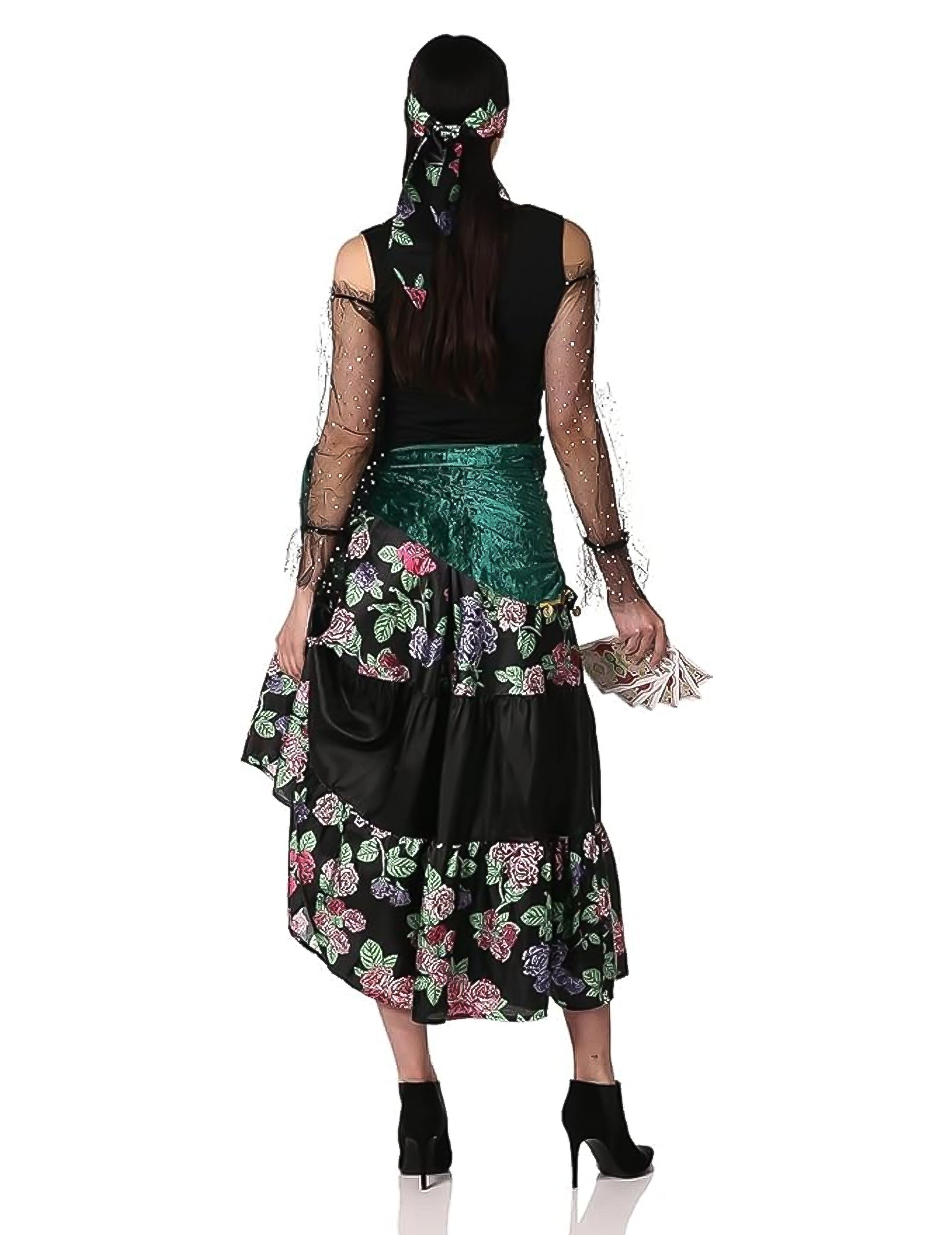 Acest costum LED pentru femei este format dintr -o cămașă cu corset, o fustă, o centură, o bandă de cap și 6 cărți Taro. (Bilă de cristal, colier și încălțăminte nu sunt incluse). Cămașa este neagră cu mâneci lungi transparente și un corset violet cu dantelă portocalie. Centura este verde, cu decorațiuni în formă de monede de aur. Acest lucru vă va regla dimensiunea și va adăuga la fusta neagră cu modele în trandafiri. Black Banner va aminti modelele de trandafiri ai fustei. Cele 6 cărți de tarot vor aduce acest aspect al unui stat de aventură bun. Acest costum va fi perfect pentru a vă pune în pantofii unui văzător pentru Halloween.