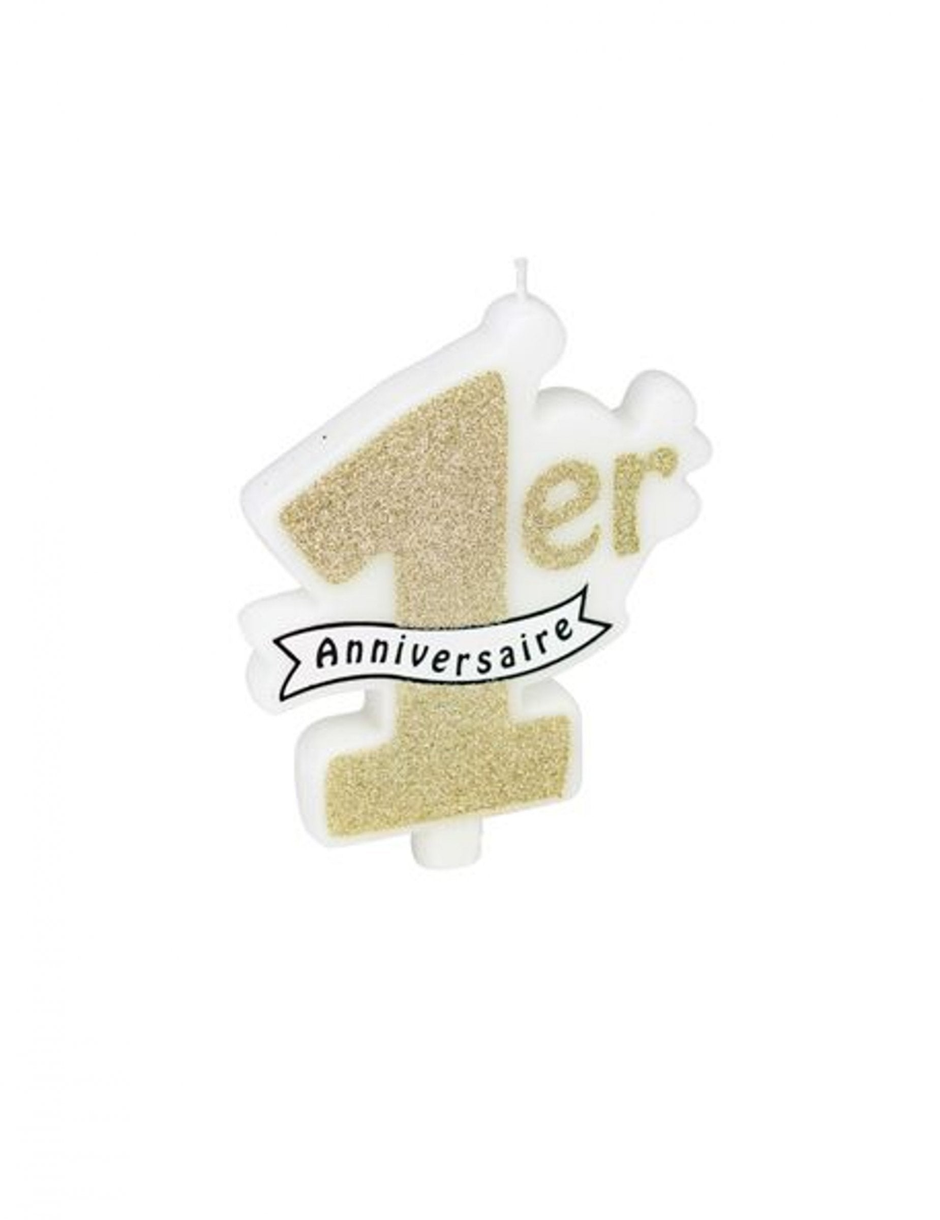 Este de culoarea șampaniei cu sclipici și formează cuvintele „Prima aniversare".
