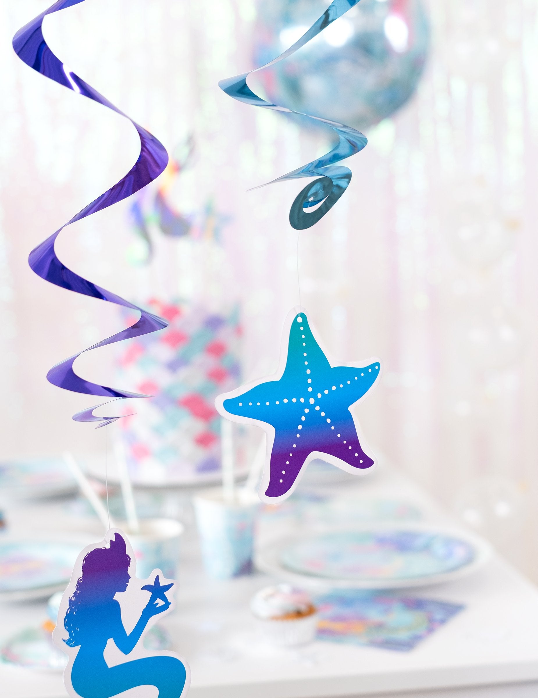 Acest lot este format din 12 suspensii de sirenă. În acest lot, veți avea 6 suspensii în spirală de aproximativ 43 cm lungime și 6 suspensii înfrumusețate cu un autocolant. Vignetele reprezentând sirene, scoici și stele de mare. Acest lot va fi perfect pentru a vă completa decorarea sirenei pentru o petrecere de naștere.