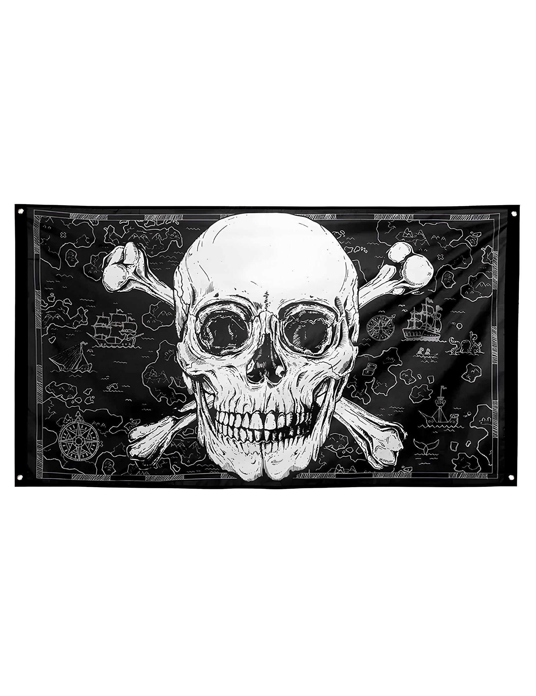 Acest steag pirat măsoară aproximativ 150 x 90 cm. Ele reprezintă un cărucior negru cu un craniu. Ochelarii din cele 4 colțuri vor permite să fie ușor de fixat. Acasă acest pavilion pirat în decorarea ta în timpul unei petreceri tematice pirat!