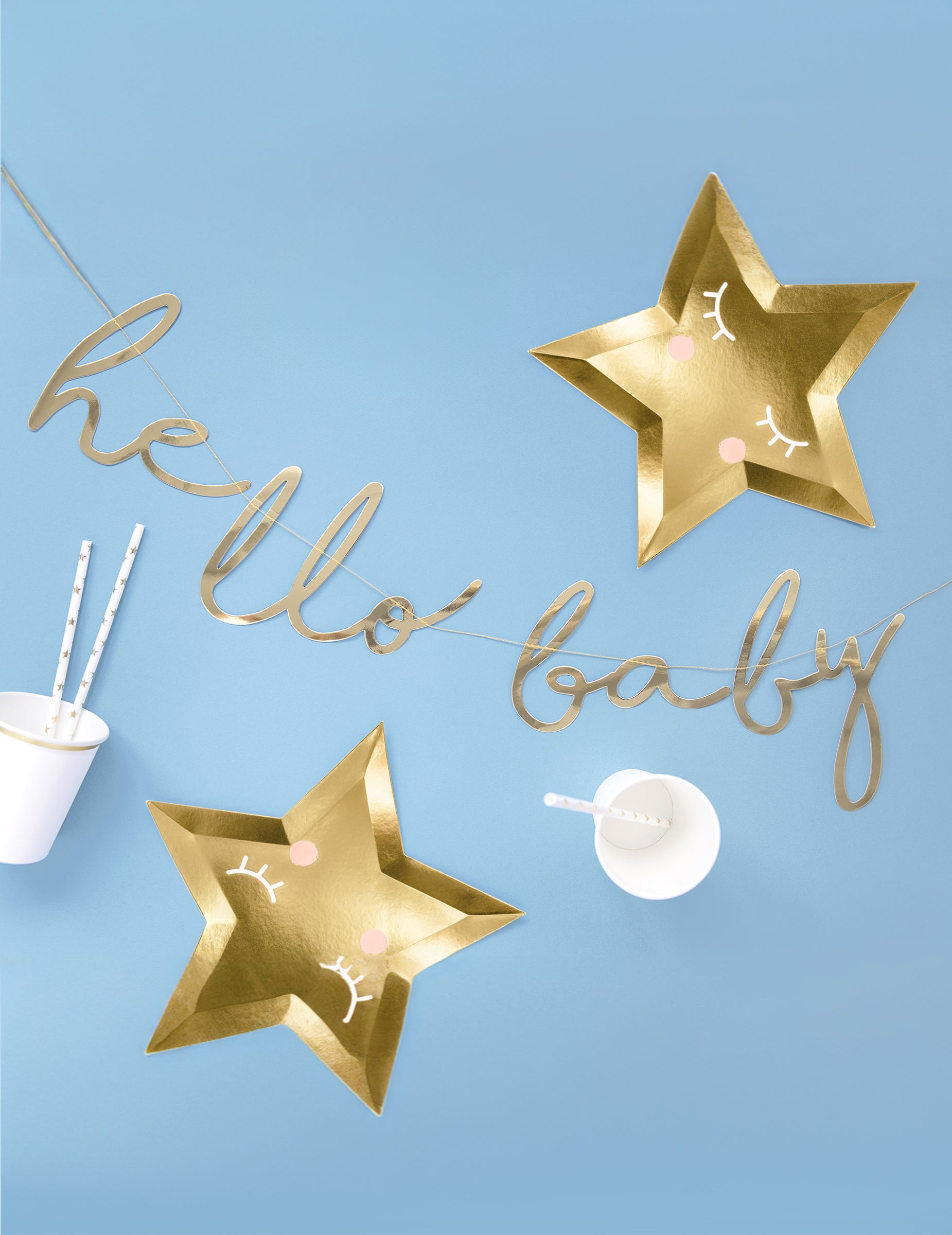Ghirlandă din carton auriu metalizat „Hello Baby”, 18 x 70 cm cm pentru petrecerea de baby shower