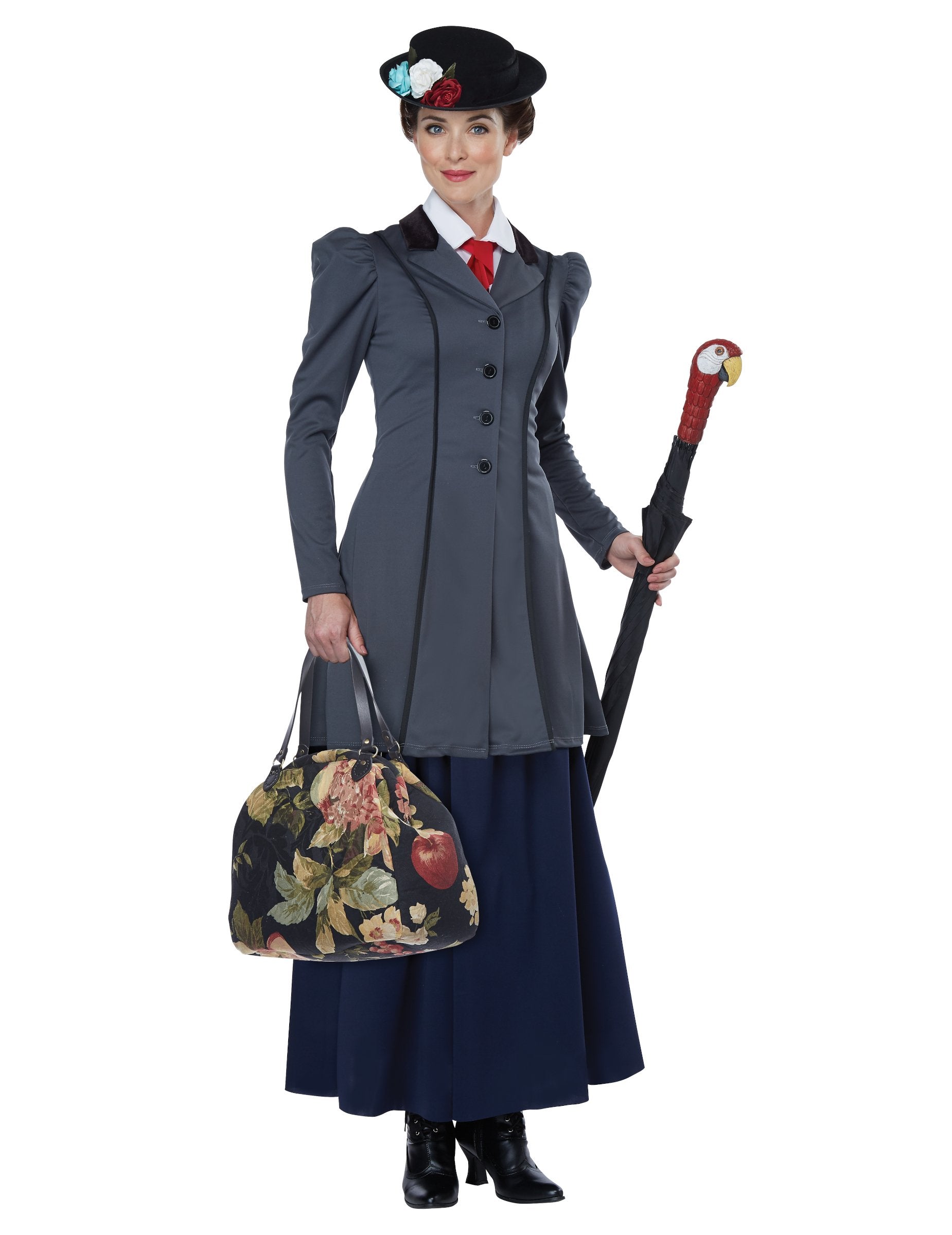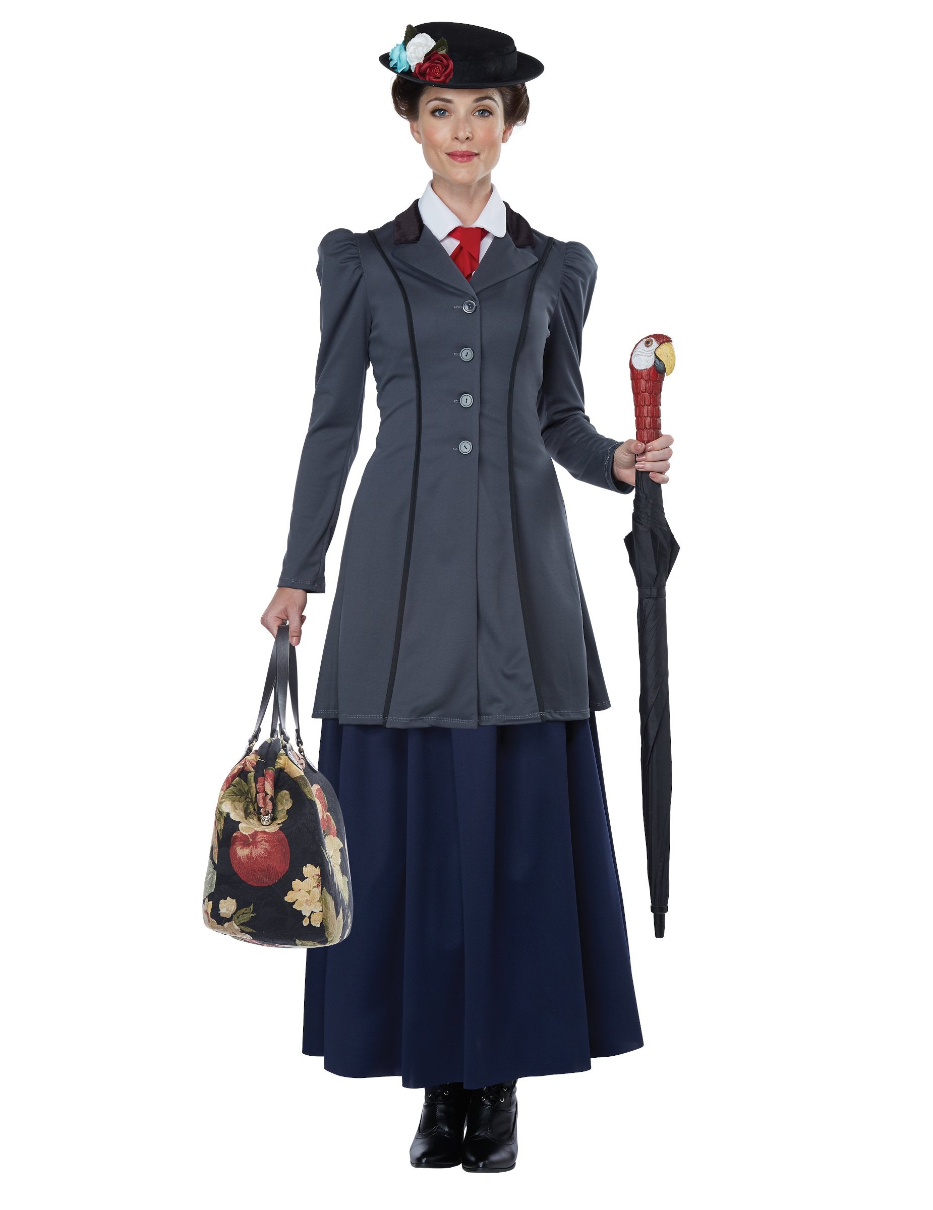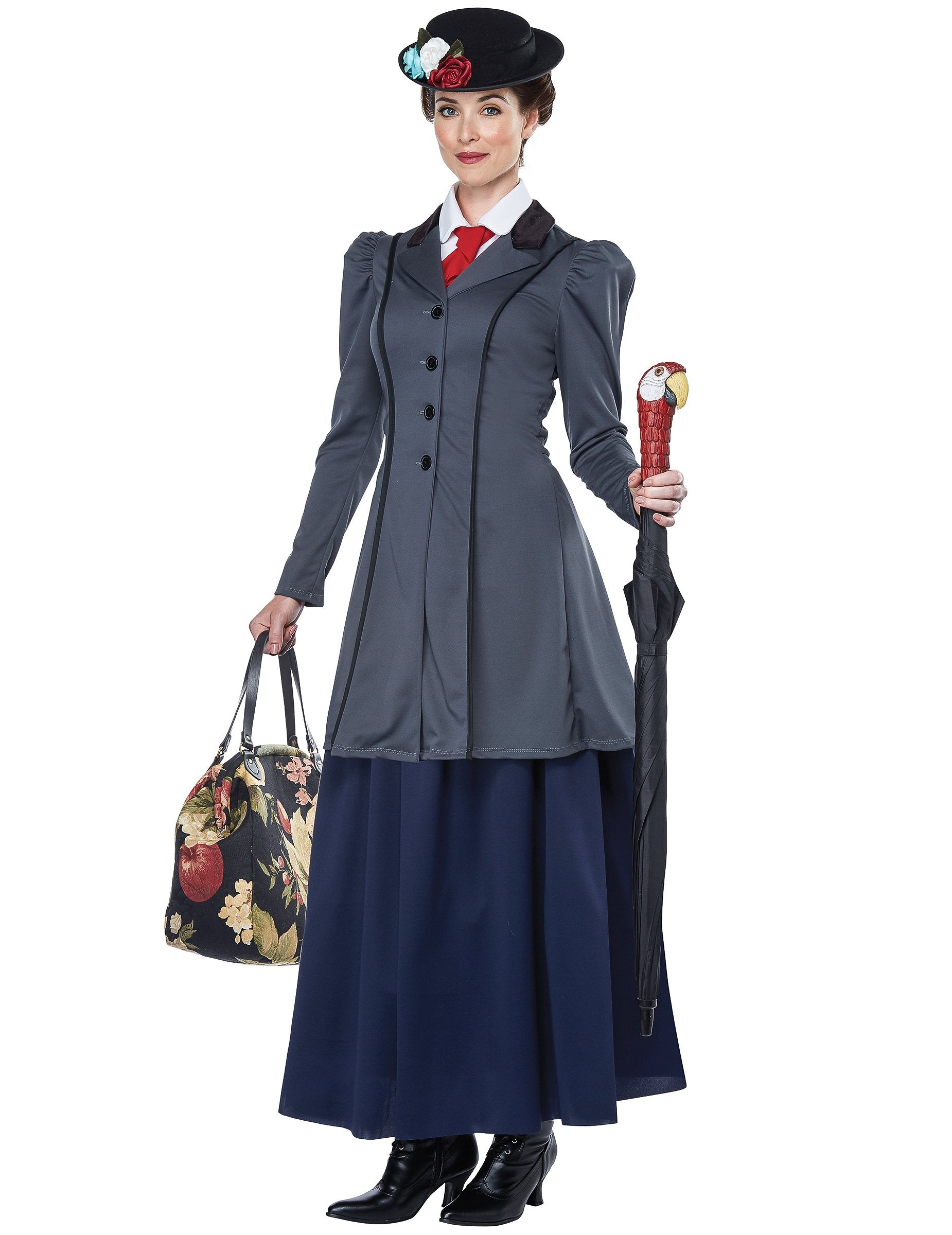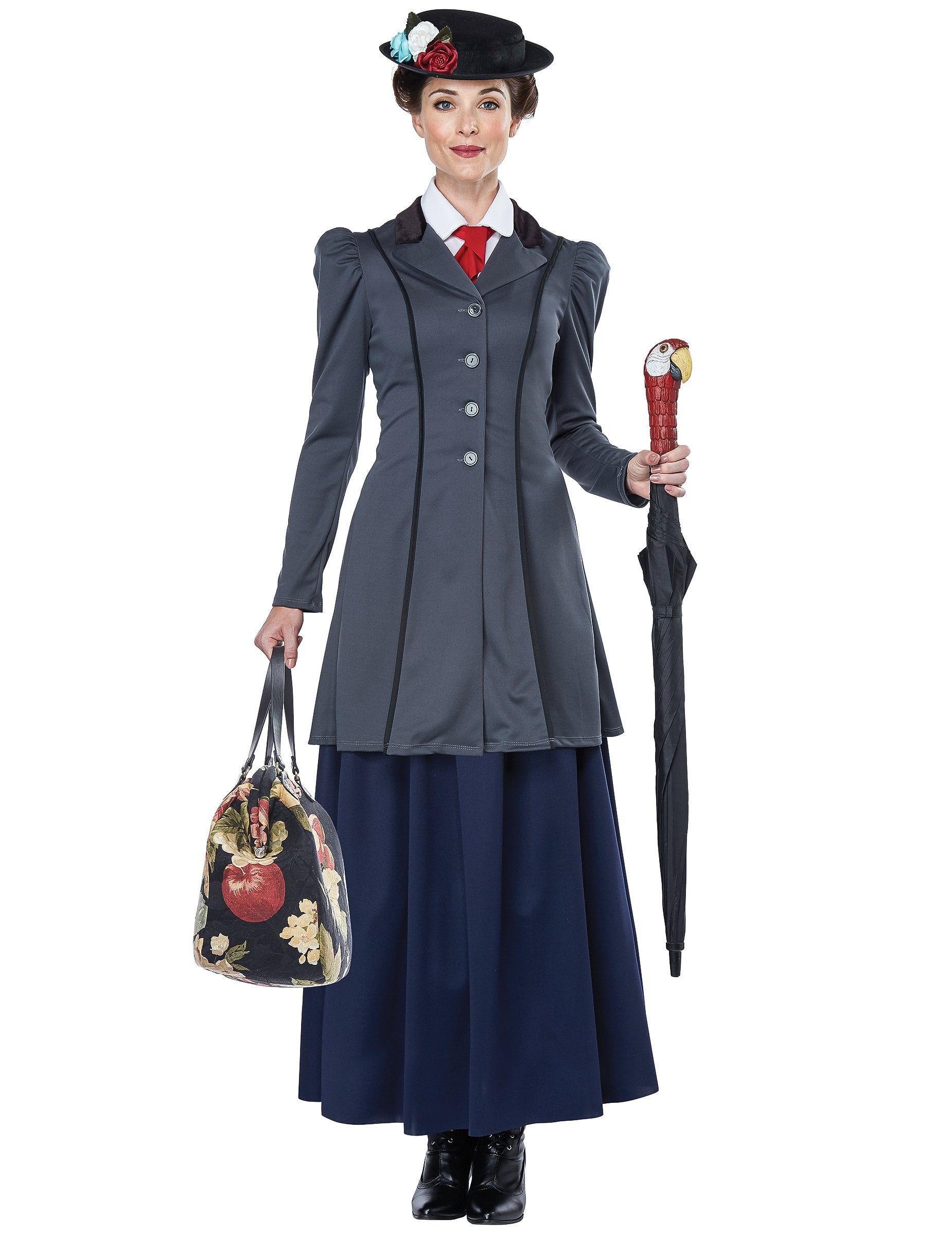 Această deghizare a asistentei engleze este formată dintr -o geacă, o fustă, o cultură, o pălărie și un accesoriu pentru umbrelă. Geaca de bonă este gri, cu un efect pufos la nivelul umărului. Fusta lungă este albastru închis. Cultura imită un guler de cămașă cu cravată roșie. Este așezat sub sacou. Pălăria este neagră, cu marginea ușor ridicată. Este decorat cu flori false colorate. În cele din urmă, un accesoriu pentru a plasa pe mânerul umbrelei dvs. completează acest costum. Pentru a face acest lucru, trebuie să aveți o umbrelă cu mânerul potrivit. Accesoriul alunecă peste mâner și este imaginea unui cap de papagal. Acest sfat are o fanta, ceea ce face mai ușor să -l puneți pe o umbrelă. Acest costum complet și de calitate va fi perfect pentru a -ți întruchipa bonă preferată pentru carnaval.