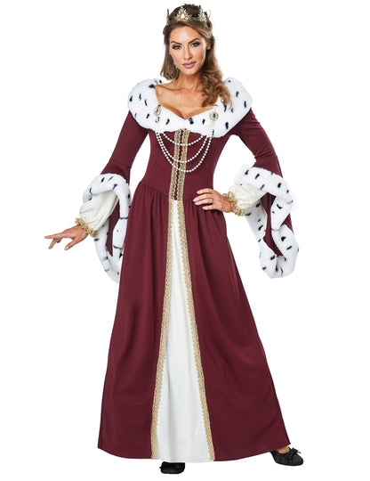 Această deghizare ca regină de basm pentru femei are o rochie și o coroană (scêptre nu este inclusă). Coroana Queen are o culoare aurie, cu pietre frumoase care au culoarea chihlimbarului. Rochia este lungă. Are culori visiniu. Marginile de aur, precum și perlele false decorează bustul cu această rochie drăguță. Și pentru și mai mult farmec, o blană albă faux observată cu negru este prezentă la piept și invers al mânecilor pagodice lungi. Acest costum de regină medievală va fi perfect pentru o seară cu temă medievală.