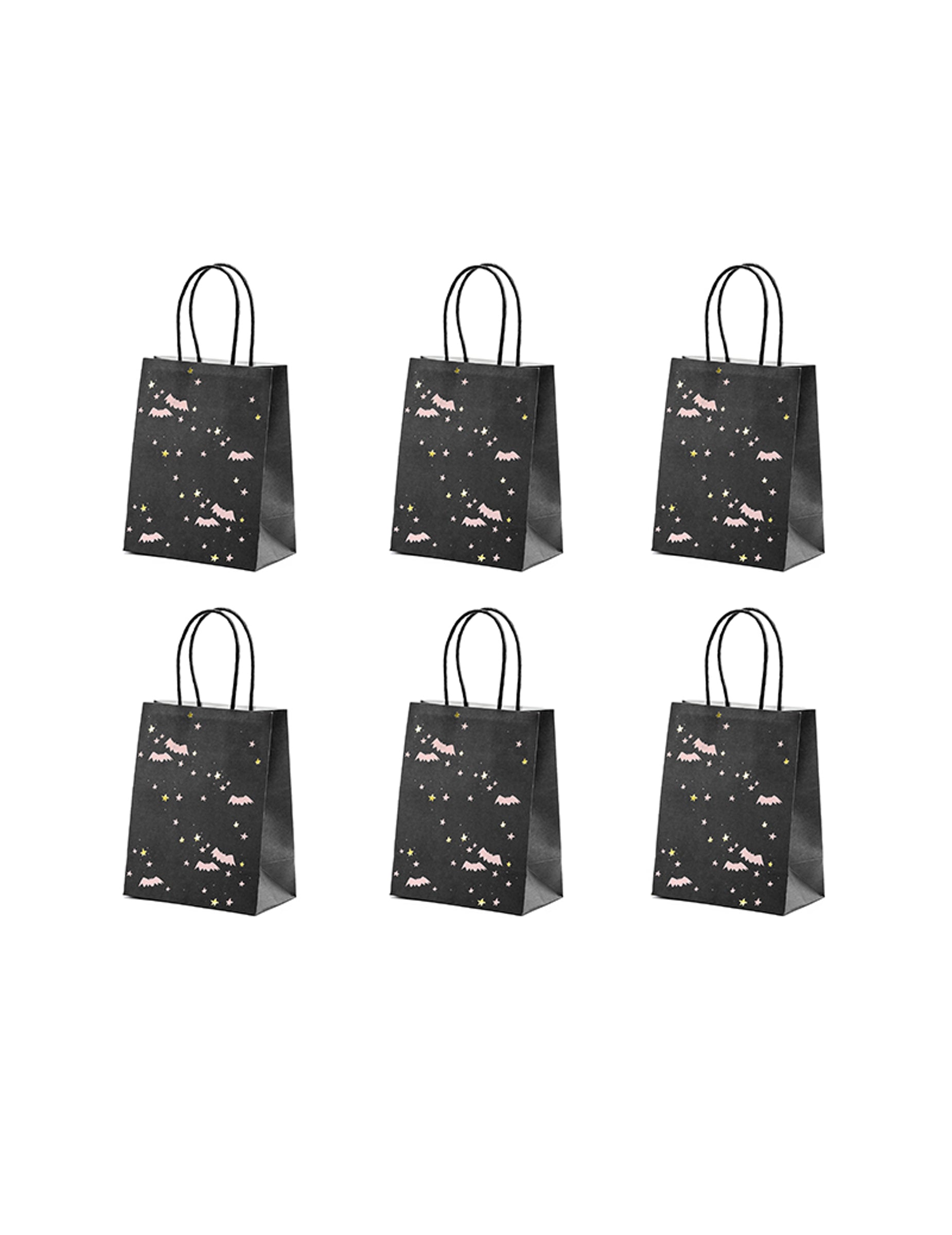 Ce lot contient 6 sacs à bonbons pour fêter Halloween avec style. Ces pochettes noires sont illustrées de chauve-souris et d'étoiles roses et dorées. Avec leurs dimensions de 14 x 18 x 8 cm, ces sacs sont parfaits pour collecter de nombreux bonbons lors de la soirée.
