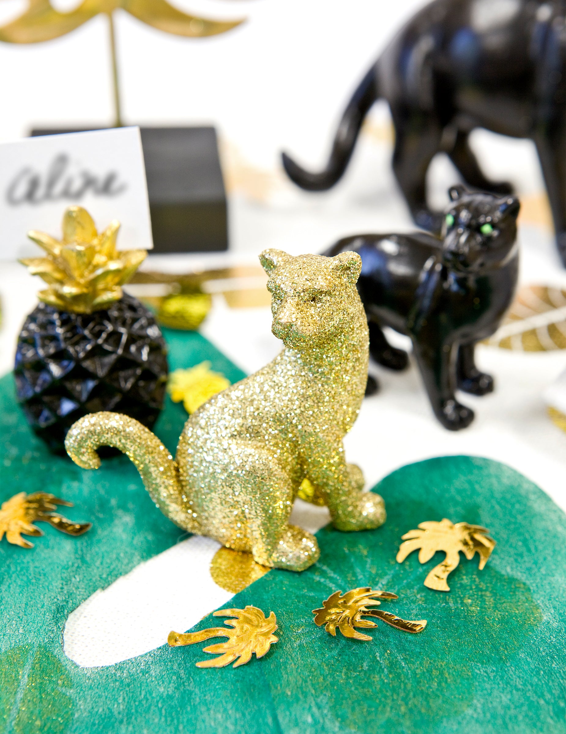 Înfrumusețează-ți masa cu această figurină panteră Un scaun cu un design rafinat. Fabricat din rășină, este împodobit cu paiete strălucitoare și măsoară aproximativ 6 cm. Integrați acest lucru panteră aurie la scenografia ta pentru a crea o decor tropical elegant și originală.