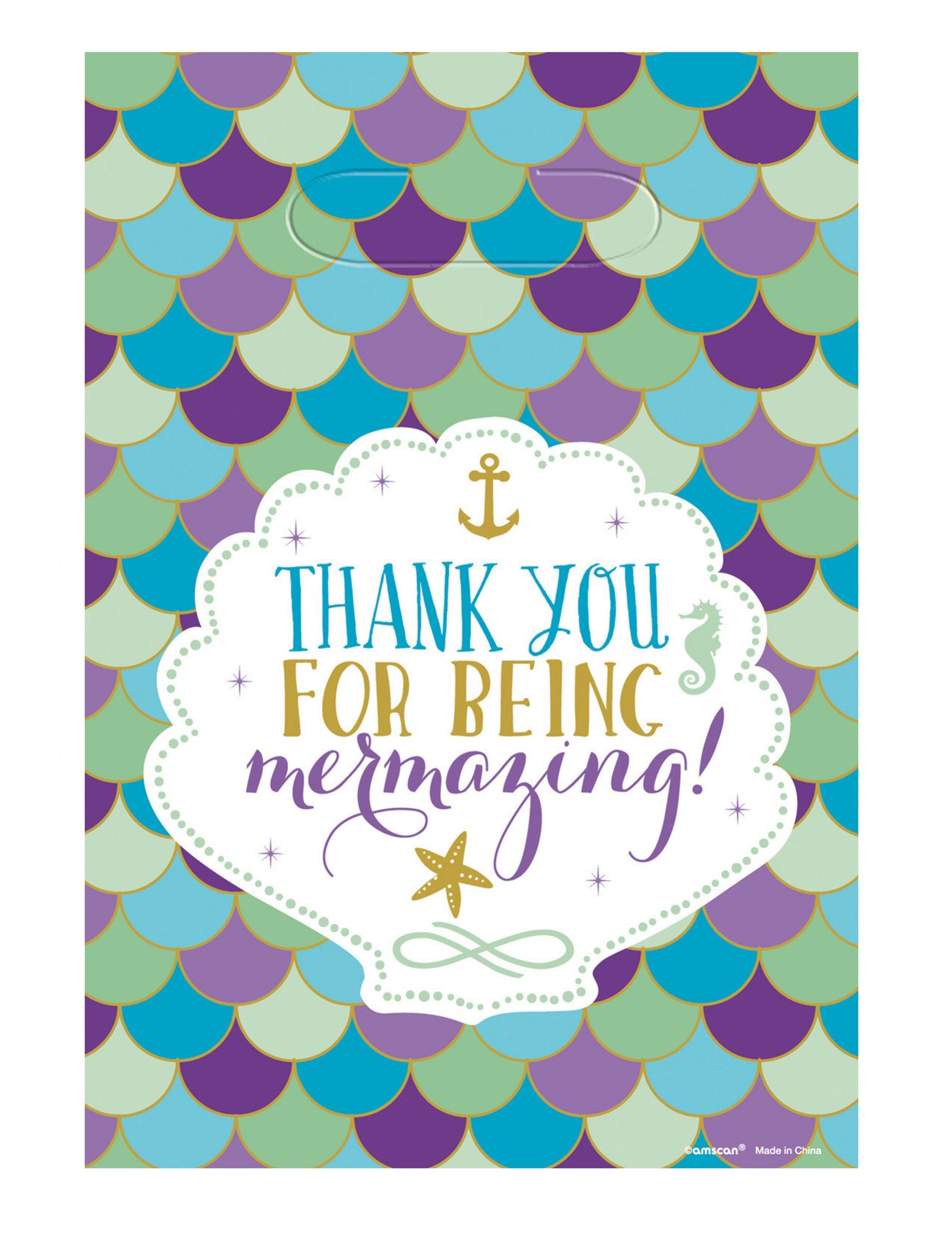 Ce lot contient 8 sacs de fête en plastique mesurant 24 x 16 cm. Leur design se compose d'écailles aux reflets violets, bleus et verts avec la mention « thank you for being mermazing ! » inscrite dans un coquillage.