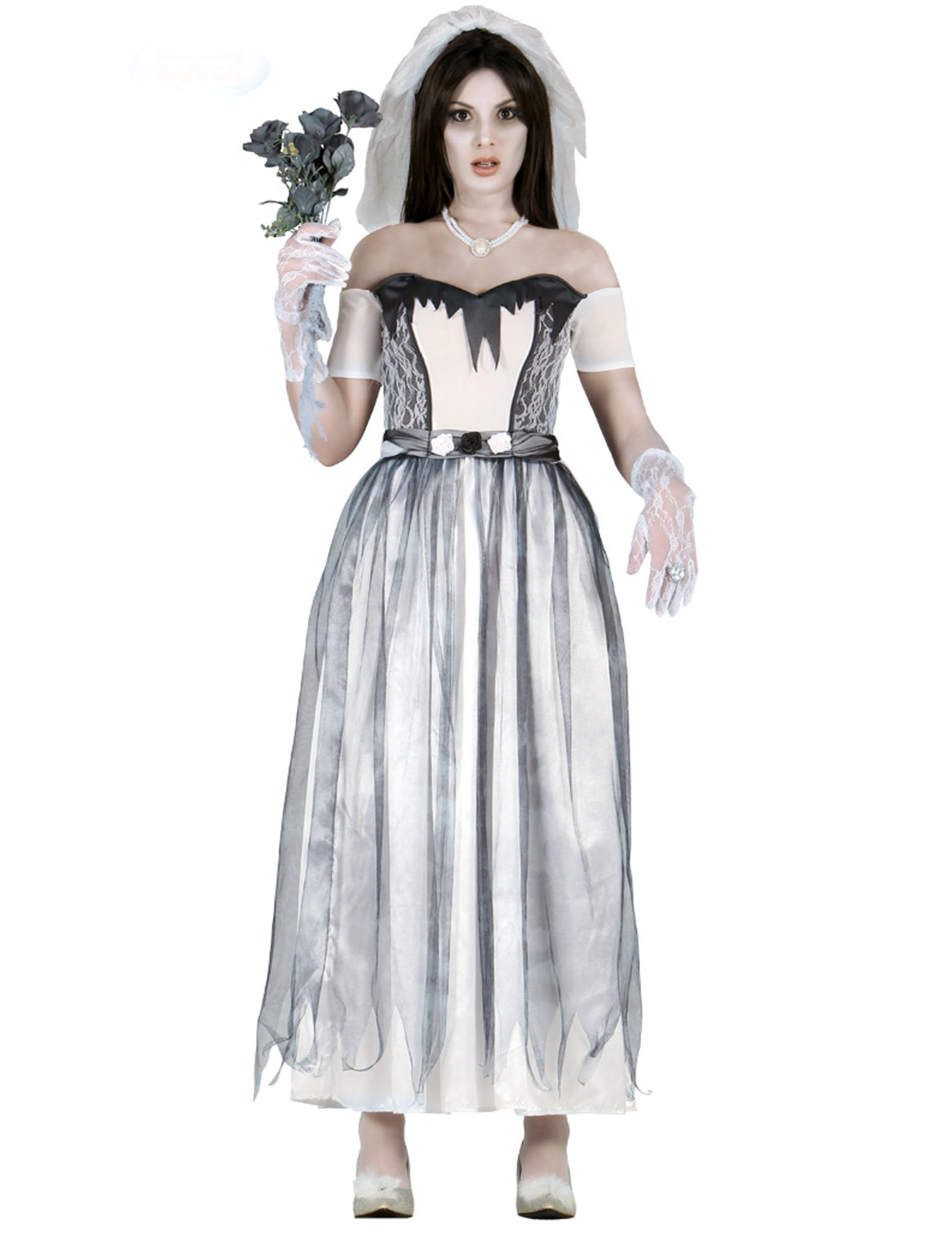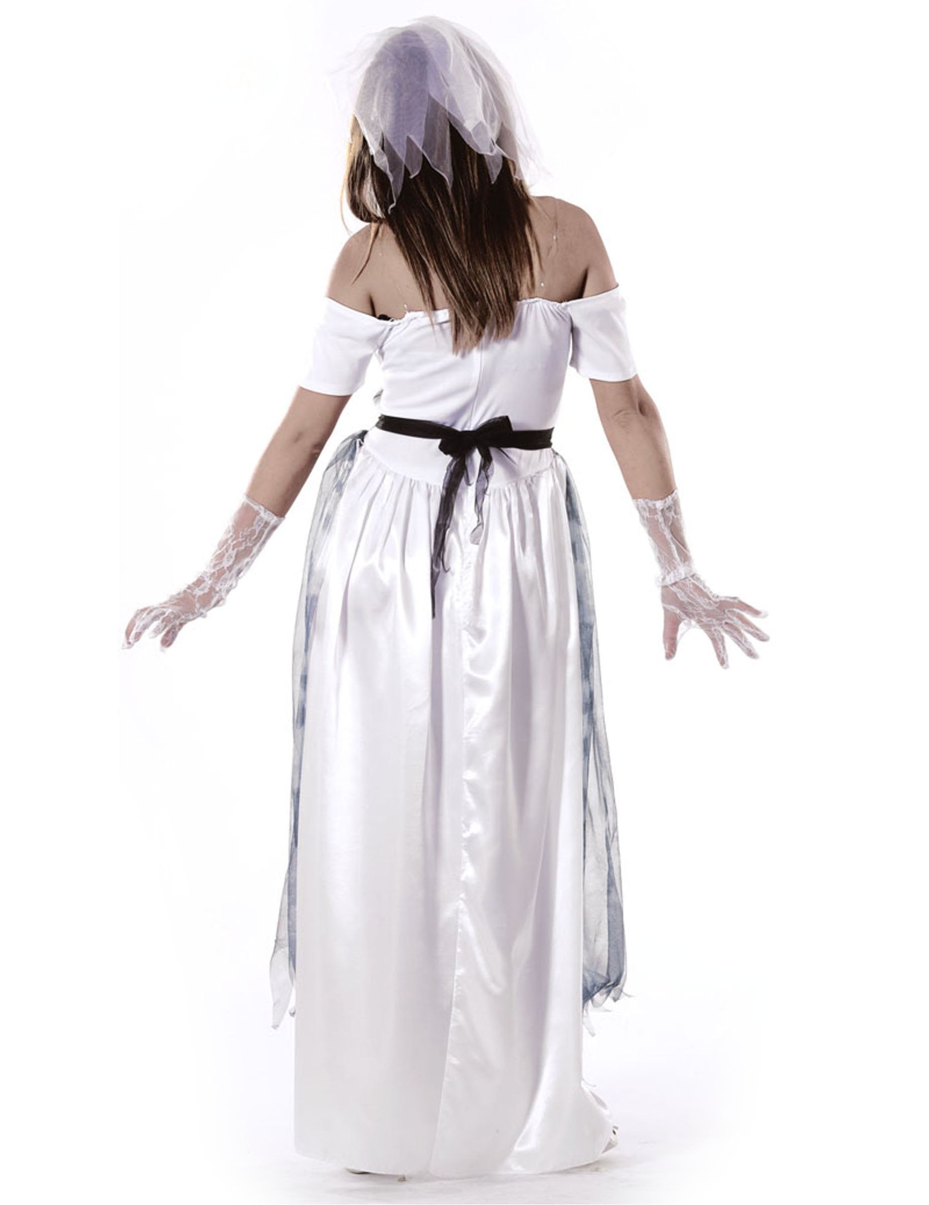 Acest costum de nuntă fantomă feminină este format dintr -o rochie și un voal. Rochia este mai plină de bustier cu o fustă lungă. Este alb și negru. Este înconjurat de o panglică neagră, decorată cu trandafiri albi și negri. Bustierul este alb în centru și negru brodat cu modele albe pe părțile laterale. Această rochie este completată de un voal alb. Acest costum de mireasă fantomă va fi perfect pentru sărbătorirea Halloween -ului!