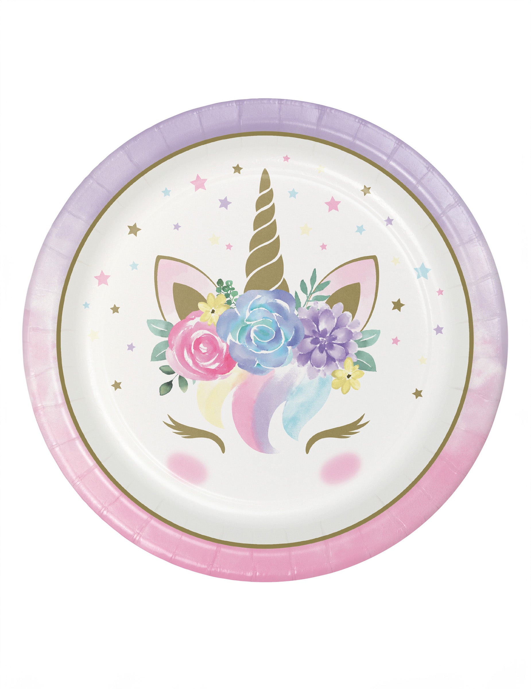Aceste plăci sunt vândute cu o mulțime de 8. Sunt confecționate din carton și reprezintă un cap de unicorn și stele mici colorate, cu margini roz-purpuriu. Diametrul lor este de aproximativ 23 cm. Adăugați aceste plăci la masa de naștere pentru o temă Unicorn!