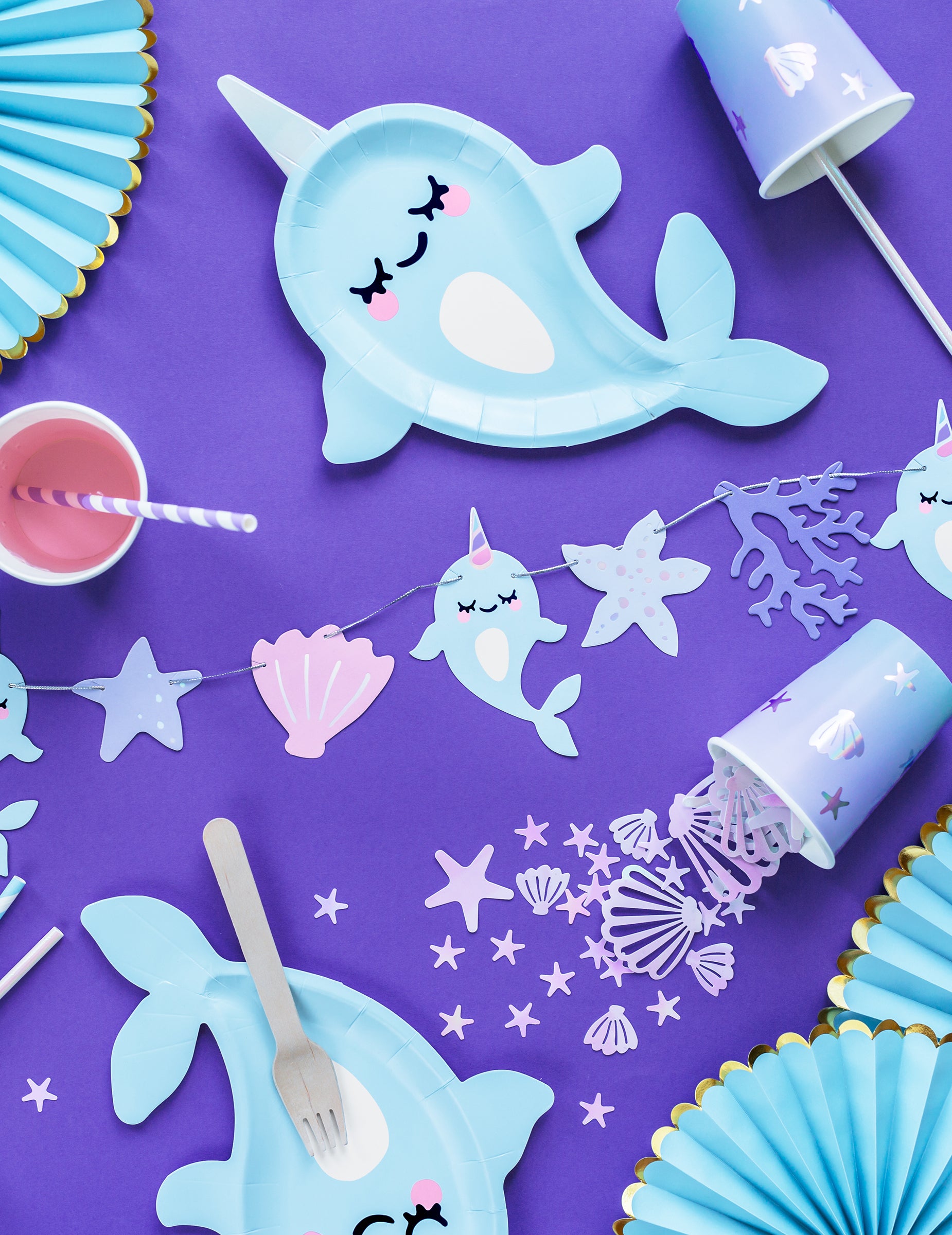 Creează o atmosferă magică cu asta ghirlandă de asamblat 1 m lungime. Acest pachet complet include 3 unicornii mării...precum și mai multe elemente marine: 4 stele de mare de diferite dimensiuni, 2 corali și 2 scoici, însoțite de 2 metri de fir argintiu. Foarte ușor de agățat de capete, acesta ghirlandă va fi perfect pentru a vă îmbunătăți ziua de naștere pe tema narvalilor sau a sirenelor.