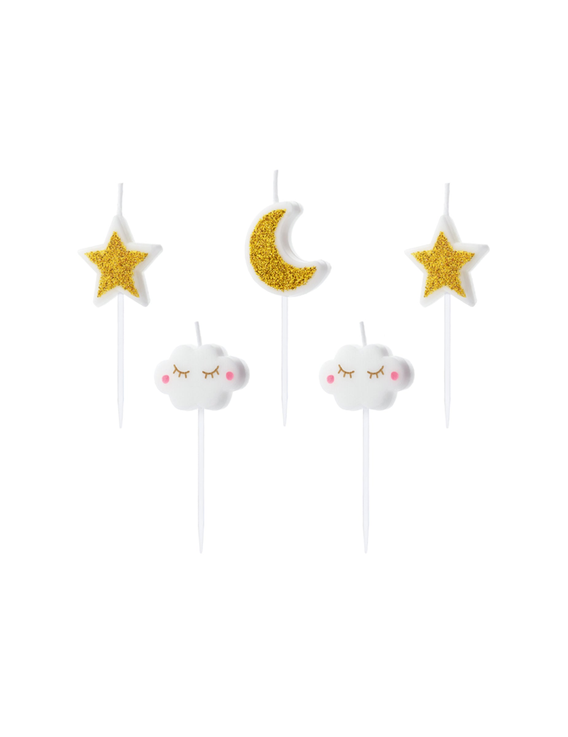 Îmbunătățește-ți tortul cu acest set de 5 lumânări de ziua de naștere măsurând aproximativ 2 până la 3 cm. Acest kit include 2 drăguțe nori2 mici stele precum și un croissant din lună decorat cu sclipici auriu. lumânări va fi accesoriul perfect pentru a completa decorul în timpul unei ziua de naștere în cer.