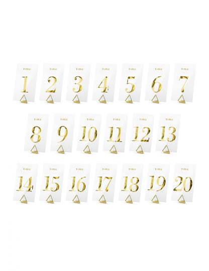 Aceste 20 de tabele de marcă măsoară aproximativ 7 x 12 cm (suporturi care nu sunt incluse). Lotul este transparent cu inscripția „tabel” și o figură de aur de la 1 la 20. Acest lot de mese de marcă va fi perfect pentru a crea o atmosferă elegantă la nunta ta.