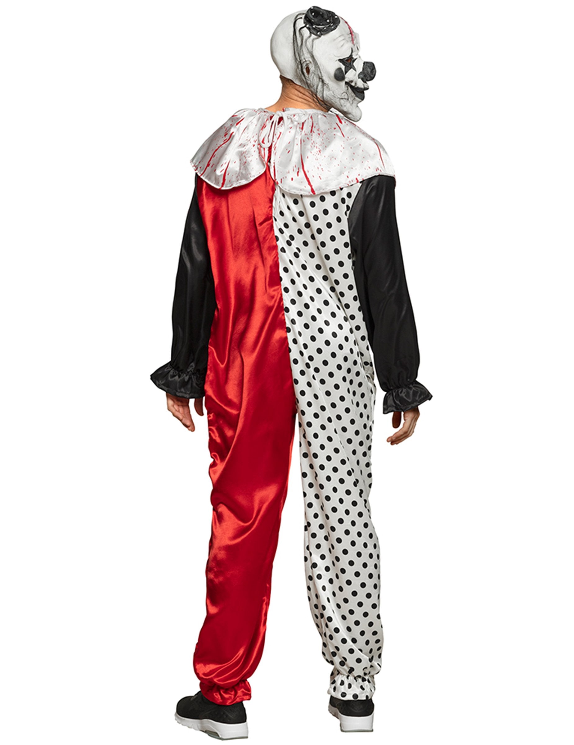 Acest costum psiho de clovn este pentru adulți, este format dintr -o combinație (nu este inclusă masca). Combinația este roșie, alb cu puncte negre și negru. Partea inferioară a mânecilor și a picioarelor este păstrată de un elastic pentru a crea un efect pufos. În cele din urmă, un guler alb pătat de sânge completează acest costum. Acest costum psiho de clovn va fi perfect pentru Halloween.