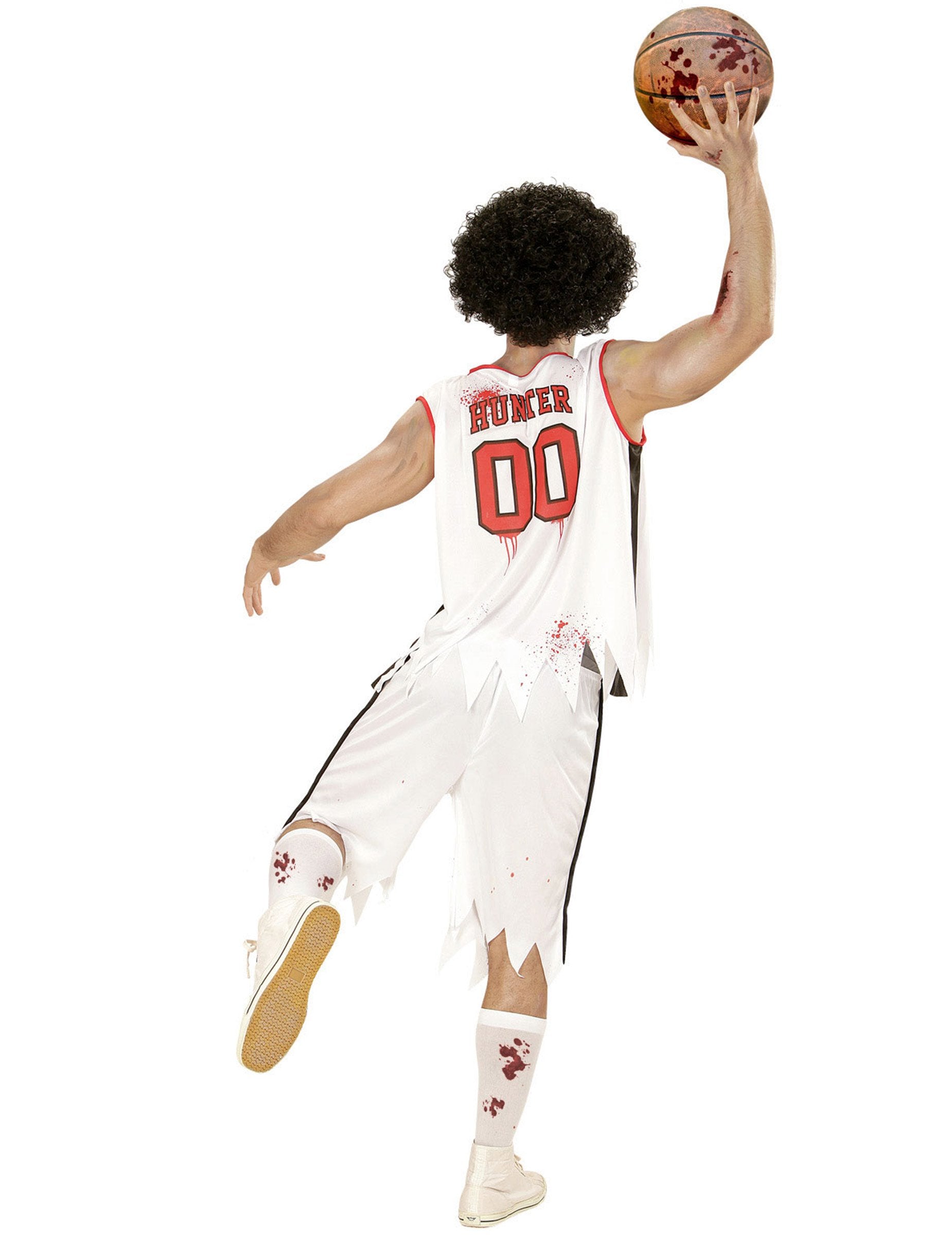 Această deghizare a jucătorului de baschet zombie este pentru bărbați, este formată dintr -un top de tanc, precum și pantaloni scurți (minge, șosete, peruci și adidași care nu sunt incluse). Blatul rezervorului este alb cu imprimarea „Blood 00” pe față și „Hunter 00” în spate. Acesta este pătat de sânge pentru a aduce latura realistă a costumului. La nivelul părții superioare a blatului rezervorului, o bordură roșie este prezentă cu o bandă neagră pe fiecare parte a blatului rezervorului. Pantaloni scurți sunt, de asemenea, albi, cu pete de sânge și benzi negre pe fiecare parte. Acest pantaloni scurți sunt elastici la talie pentru mai mult confort. Rezervorul, precum și pantalonii scurți se termină în Sawtooth. Acest costum va fi perfect cu ocazia unei petreceri deghizate sau de Halloween.