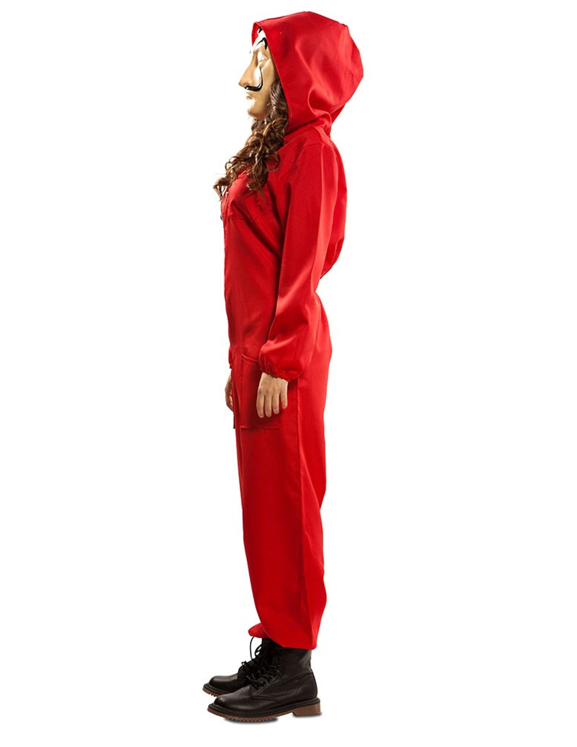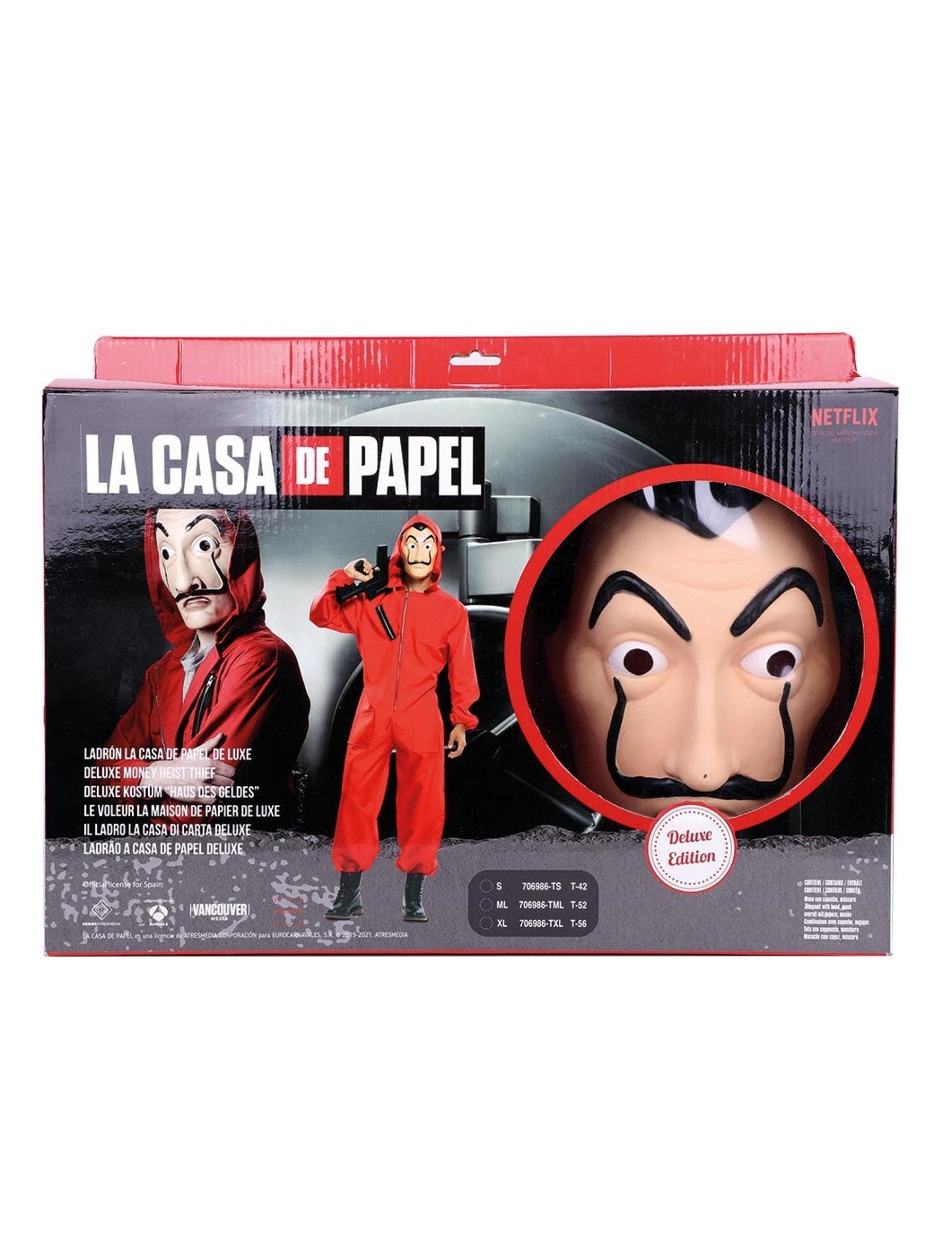 Această cutie de costume Casa de Papel pentru adulți este sub licență oficială. Este format dintr -o combinație și o mască. Combinația este roșie și are o capotă. Este elastic doar la încheieturi. Un fermoar este cusut la piept. Această combinație se închide în față datorită unui fermoar lung. Masca reprezintă chipul lui Dali, este identică cu cea purtată de tâlharii serialului de televiziune La Casa de Papel. Acest costum, livrat în cutia sa de carton, va fi perfect pentru a întruchipa unul dintre personajele din serialul TV cu ocazia carnavalului.