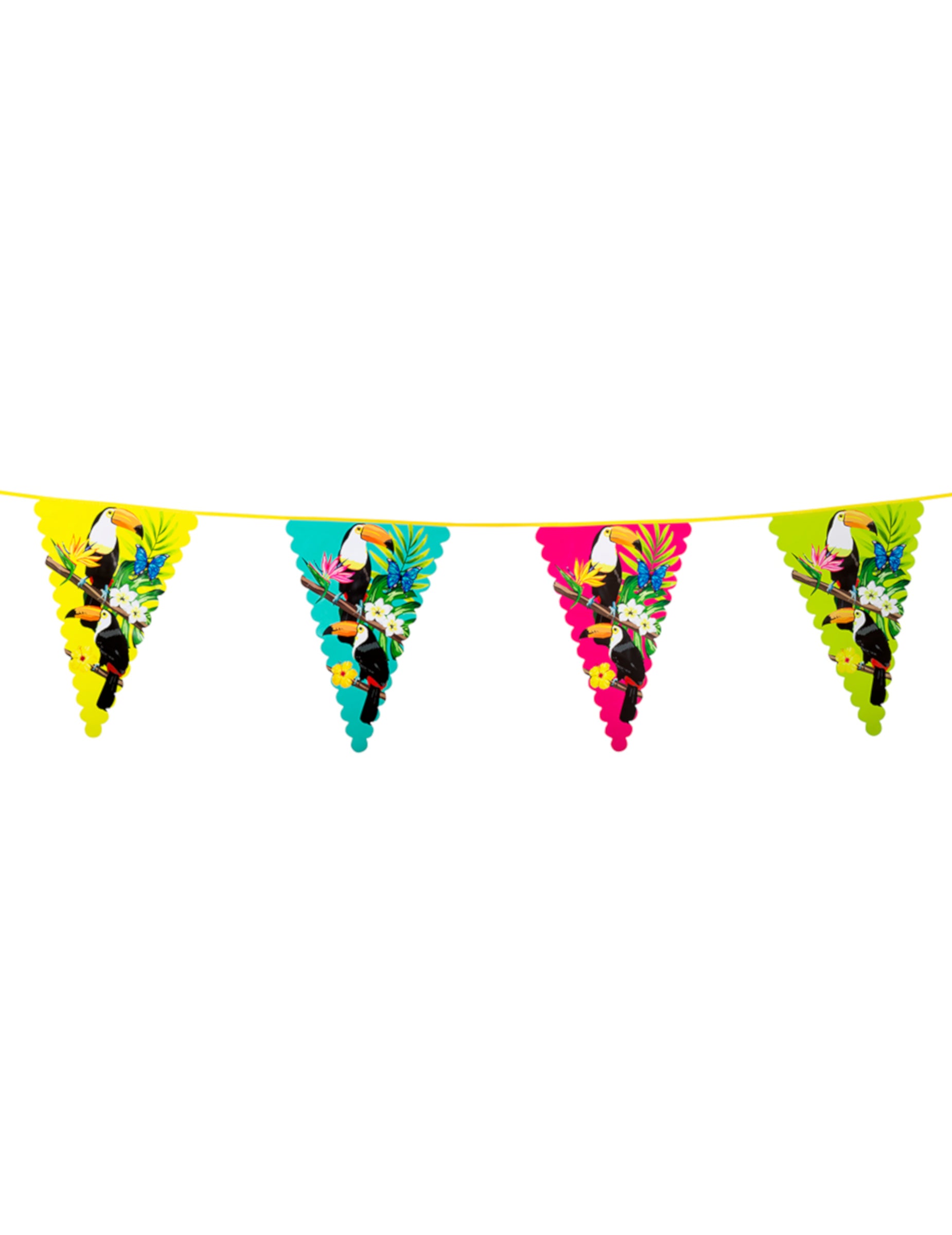 Această ghirlandă este din plastic. Măsoară aproximativ 6 m lungime și are pennante de aproximativ 45 x 30 cm. Pennanții reprezintă toucane și frunze tropicale și flori pe un fundal galben, roz, verde și turcoaz. Această ghirlandă tropicală va fi ideală pentru o decorare colorată în timpul unei petreceri hawaiene!