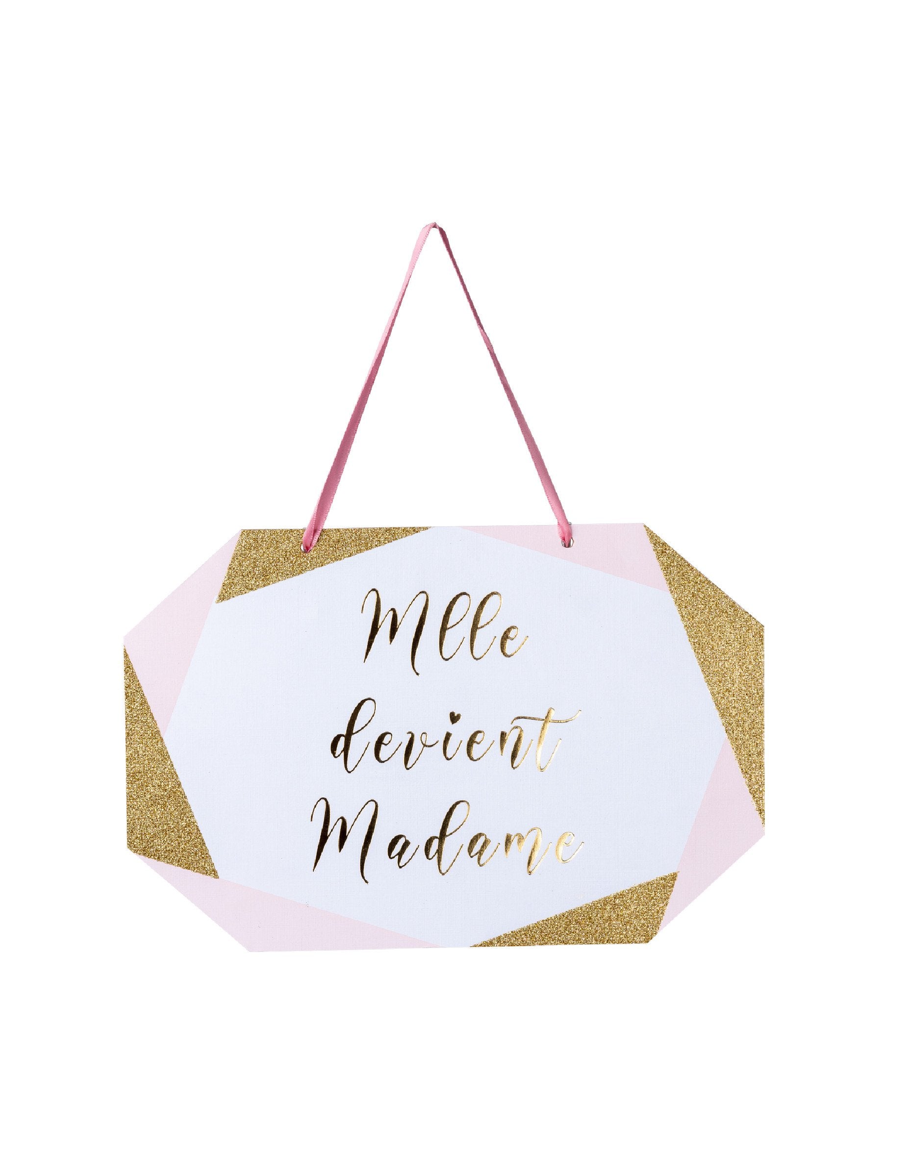 Acest semn de carton măsoară aproximativ 25 x 16,5 cm. Este alb cu conturul roz și auriu. Mai sus, este scris „Miss devine doamnă” cu litere de aur. Acest mic semn va fi perfect pentru a -ți finaliza decorarea cu ocazia petrecerii de licență.
