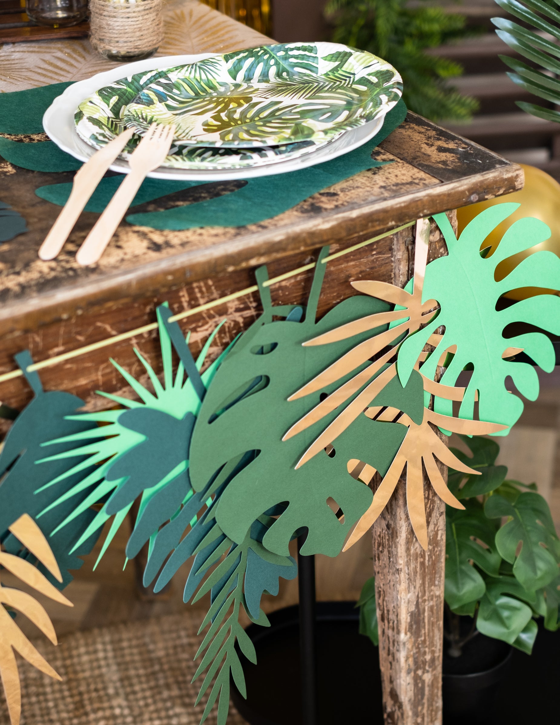 Această ghirlandă de carton are o lungime de aproximativ 2 metri și este formată din frunze tropicale în nuanțe de aur, verde deschis și verde închis. Acesta va aduce o notă naturală și elegantă decorației tale. Perfect pentru a crea o atmosferă chic din junglă, este la fel de potrivită pentru o zi de naștere exotică sau o petrecere tematică tropicală.