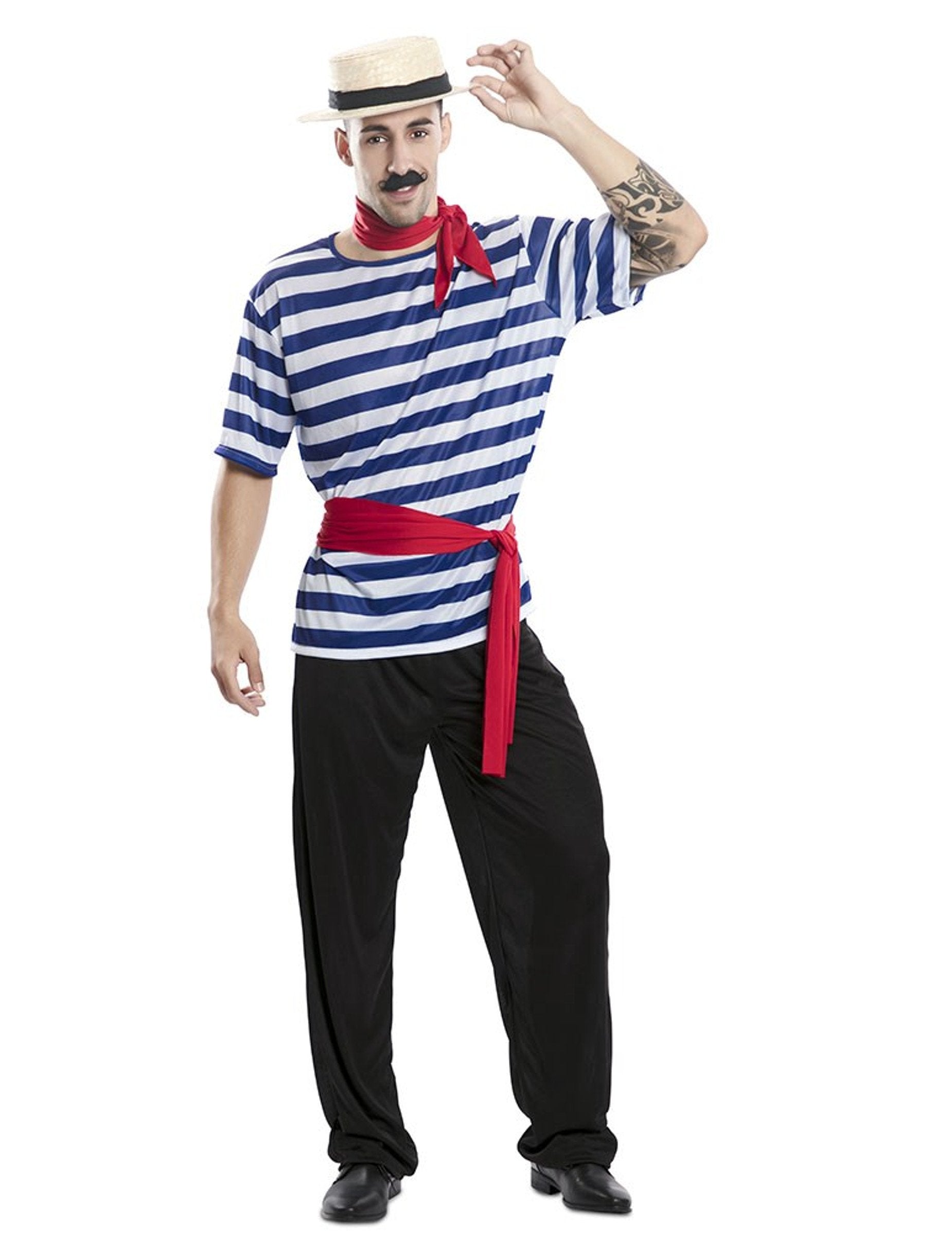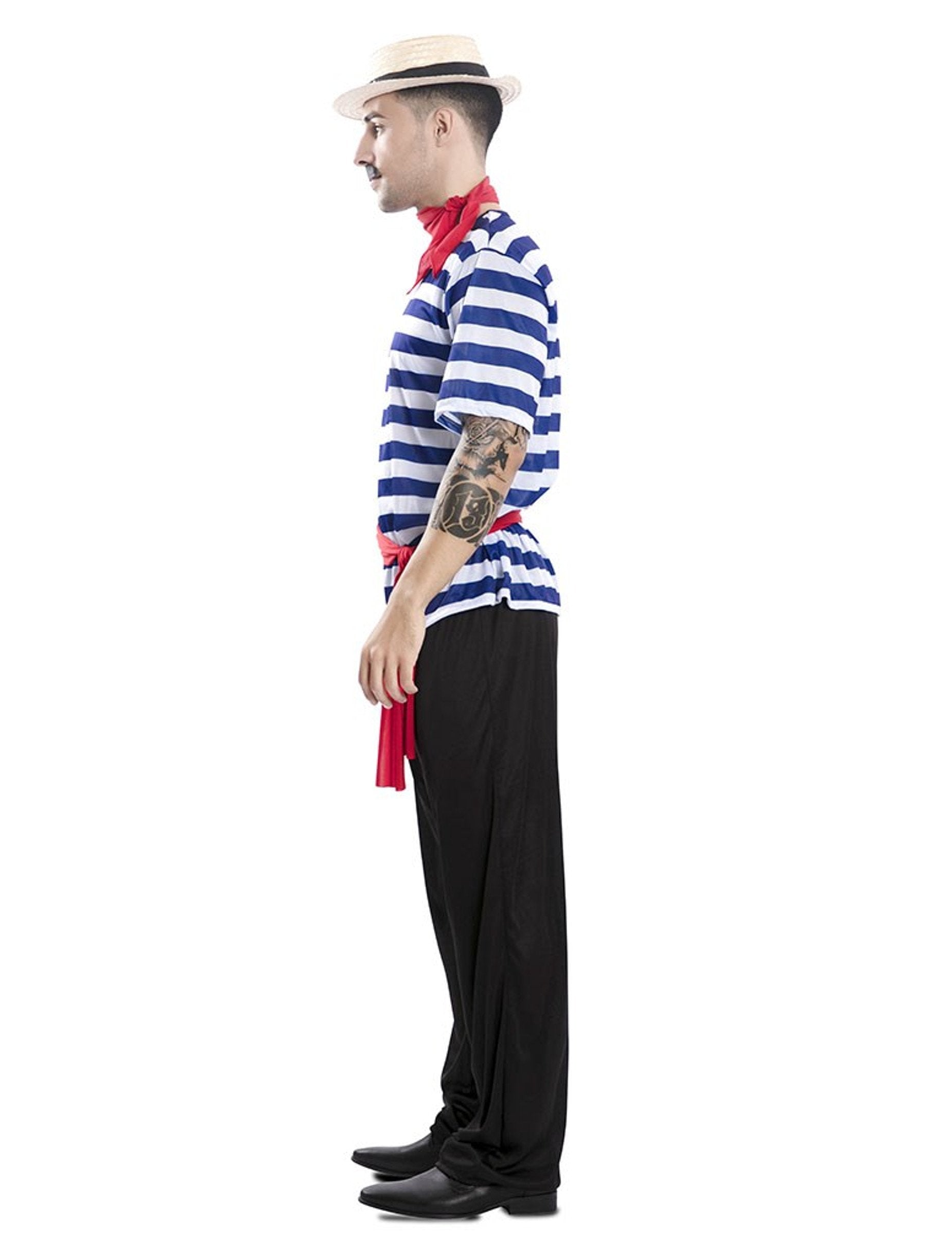 Această deghizare a gondolierului pentru adulți este formată dintr -un top, pantaloni, eșarfă și o centură (pălărie, mustață și încălțăminte care nu sunt incluse). Tricoul este dungi albastre și albe largi. Este completat de United Black Pants. Eșarfa și centura sunt cravate roșii pentru a se lega în jurul gâtului și taliei. Acest costum va fi perfect pentru a juca gondolierul venețian în timpul unei seri de costum sau pentru carnaval.
