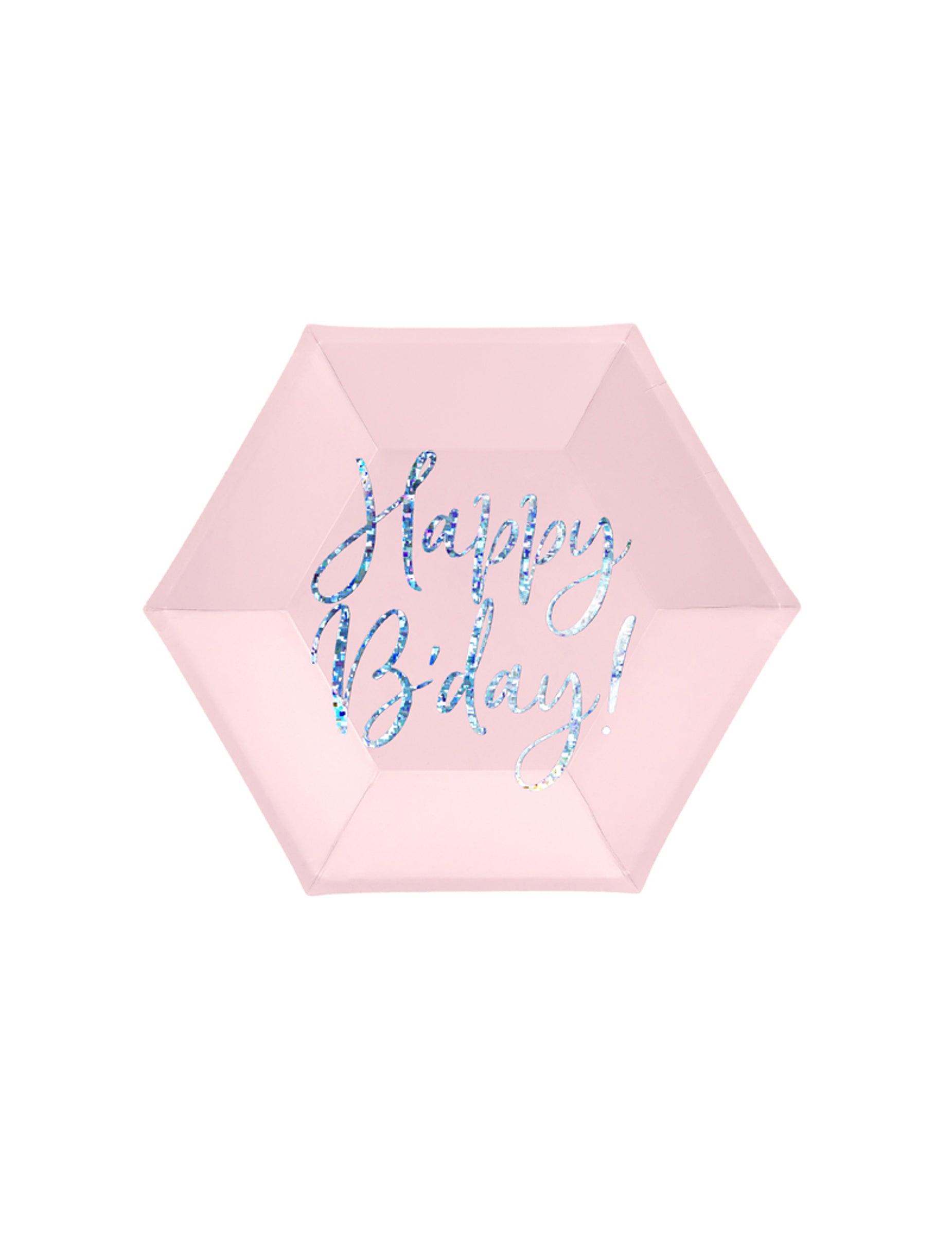Ce lot se compose de 6 assiettes fabriquées en carton rose. Elles se distinguent par leur forme hexagonale et l'inscription « Happy B'day » aux reflets iridescents. Avec un diamètre d'environ 20 cm, ces assiettes d'anniversaire sont idéales pour créer une décoration de table étincelante et tendance lors de votre événement.