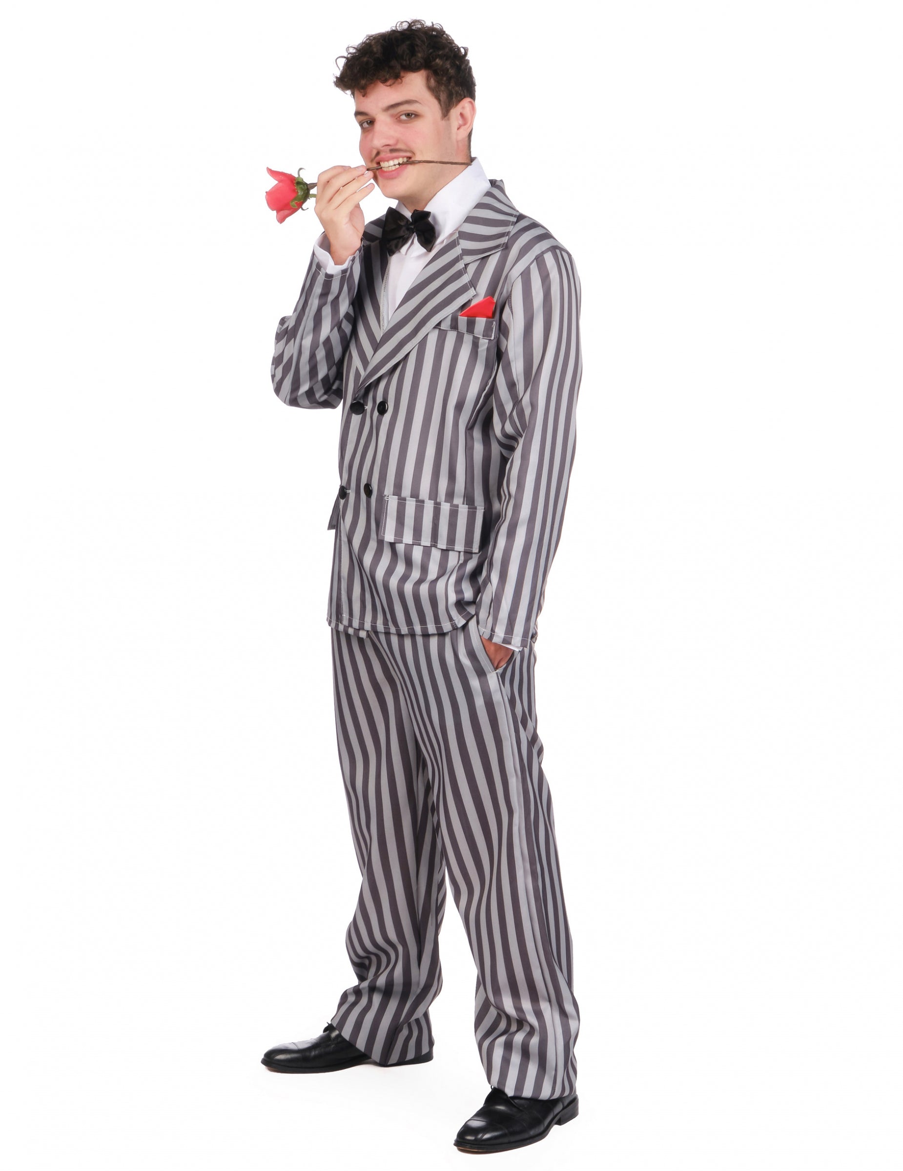 Sacoul și pantalonii costumului sunt asortate. Ambele sunt confecționate dintr-un material cu dungi verticale gri deschis și gri închis.