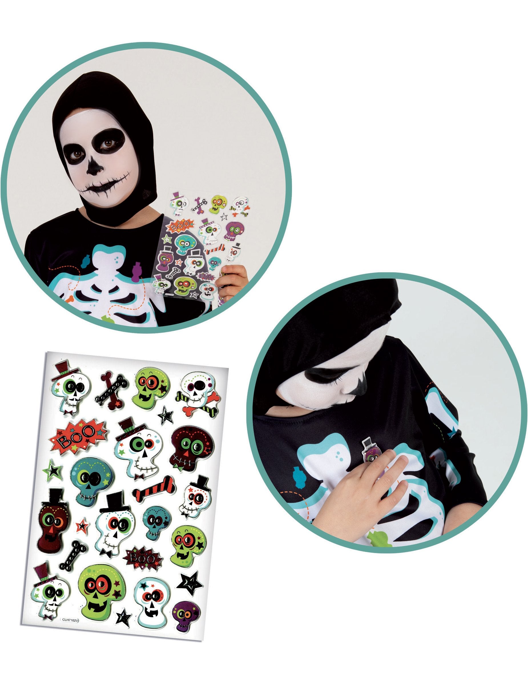 Acest costum de schelet pentru copii este compus dintr -o combinație și o placă de autoadez. Această combinație neagră este tipărită cu un schelet alb pe care puteți lipi autocolante de Halloween colorate. Va fi perfect pentru a -ți deghiza copilul în schelet colorat în timpul Halloween -ului, de exemplu!