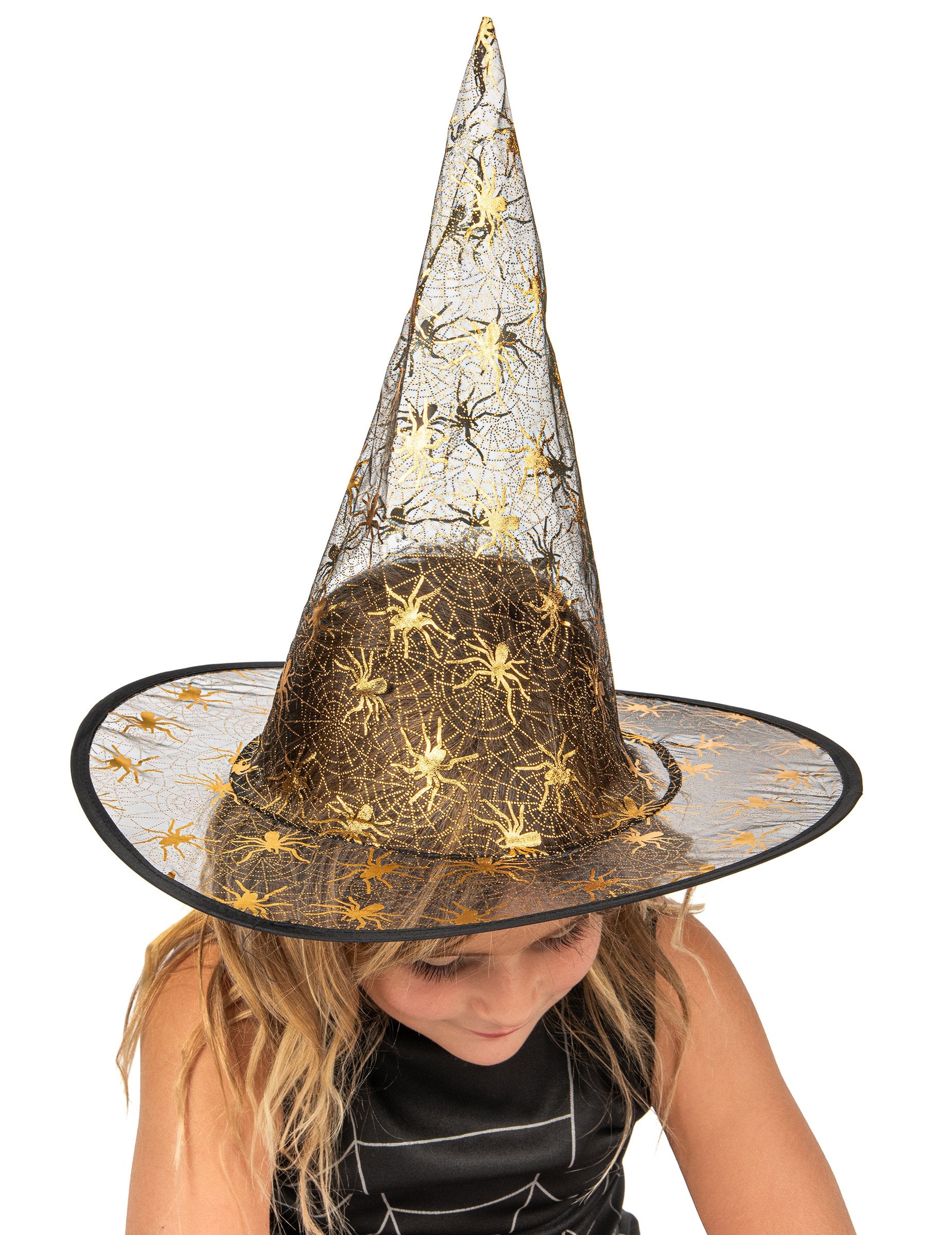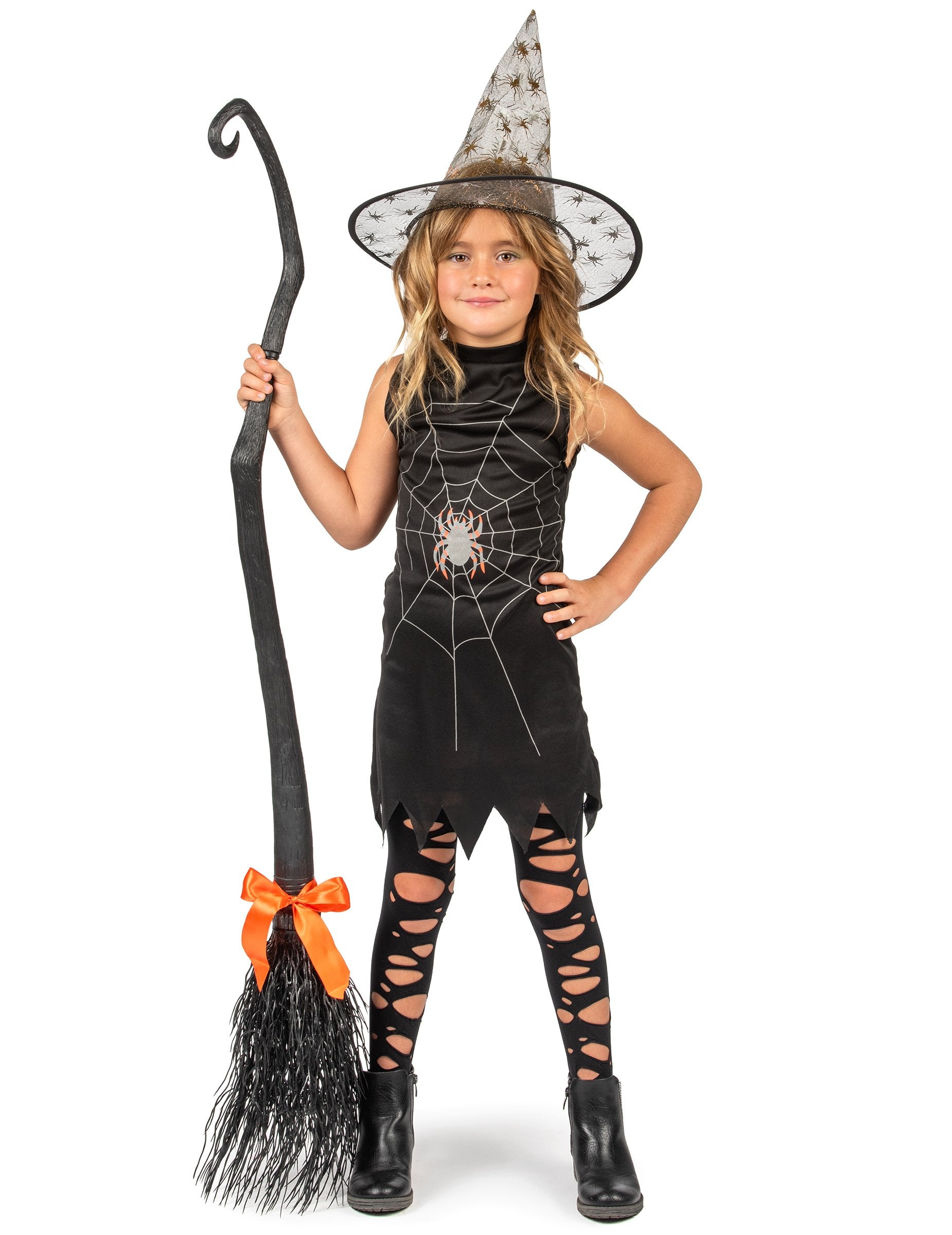 Această deghizare vrăjitoare este formată dintr -o rochie și o pălărie (colanți care nu sunt incluse). Rochia neagră este fără mâneci și este decorată cu un păianjen pe pânza sa. Partea inferioară a rochiei este tăiată în vârf. Pălăria de vrăjitoare este confecționată din țesătură transparentă neagră. Mergeți la vânătoare de bomboane, deghizându -vă ca o vrăjitoare adevărată în seara de Halloween!