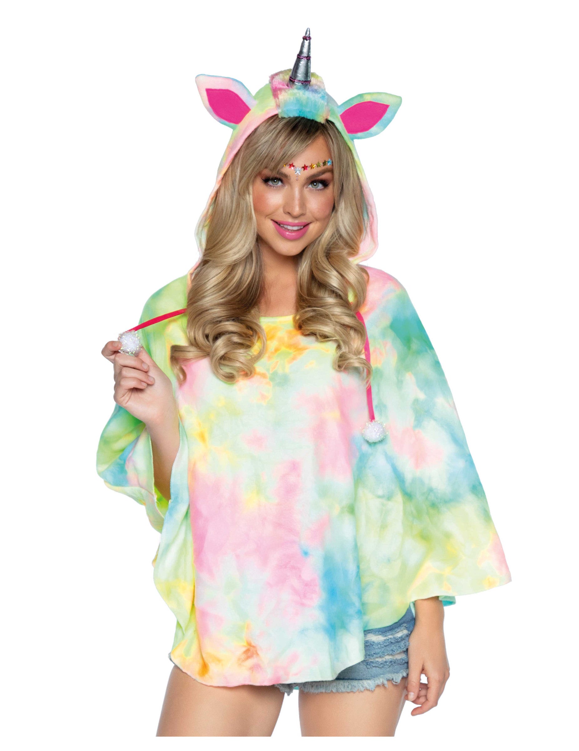Această tunică unicornă este destinată femeilor. Această tunică decorată cu mai multe culori în Tye și Dye este formată dintr -o coadă de unicorn cusută în spate, precum și o capotă. Hota are două urechi mici, precum și un claxon de unicorn color. Această ținută va fi perfectă pentru a -ți completa costumul Unicorn!