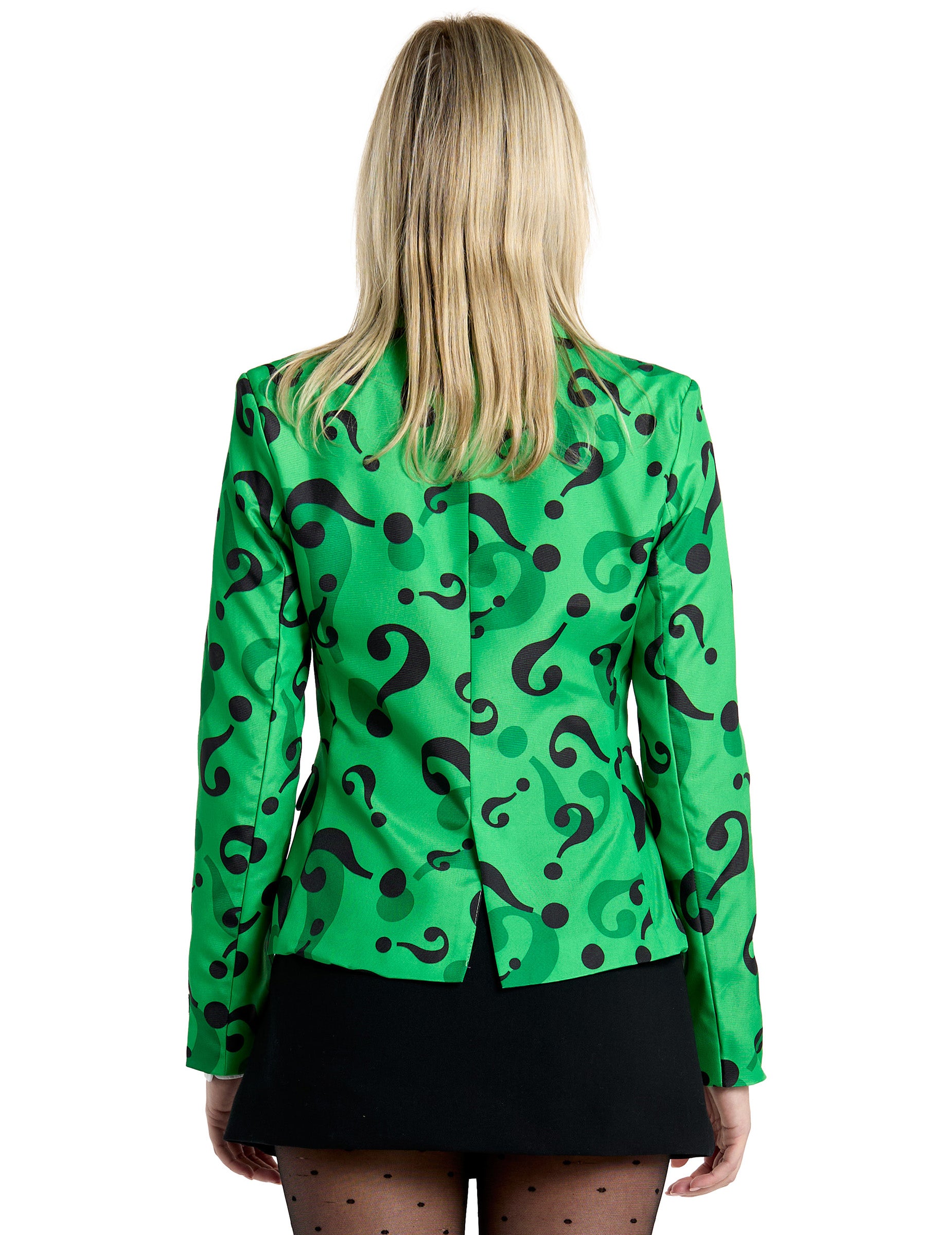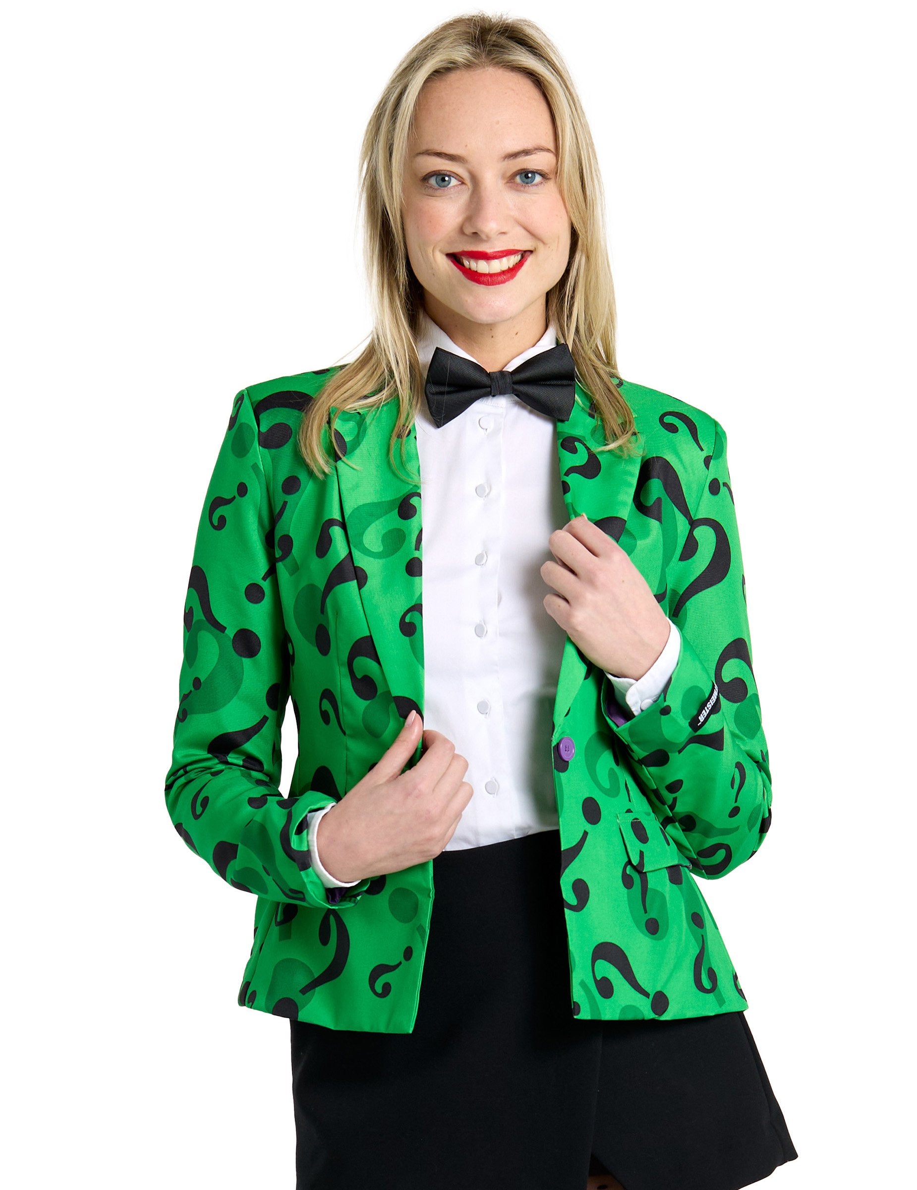Jacheta acestei femei se află sub licență oficială. Pantalonii, pantofii, papionul și cămașa nu sunt incluse. Jacheta este verde cu puncte de întrebare pentru a imita deținerea unui celebru personaj de benzi desenate, Enemy of Batman: The Riddler! Ești invitat pentru o seară pe tema supereroilor? Jacheta de licență oficială Suitmeister se va potrivi perfect!