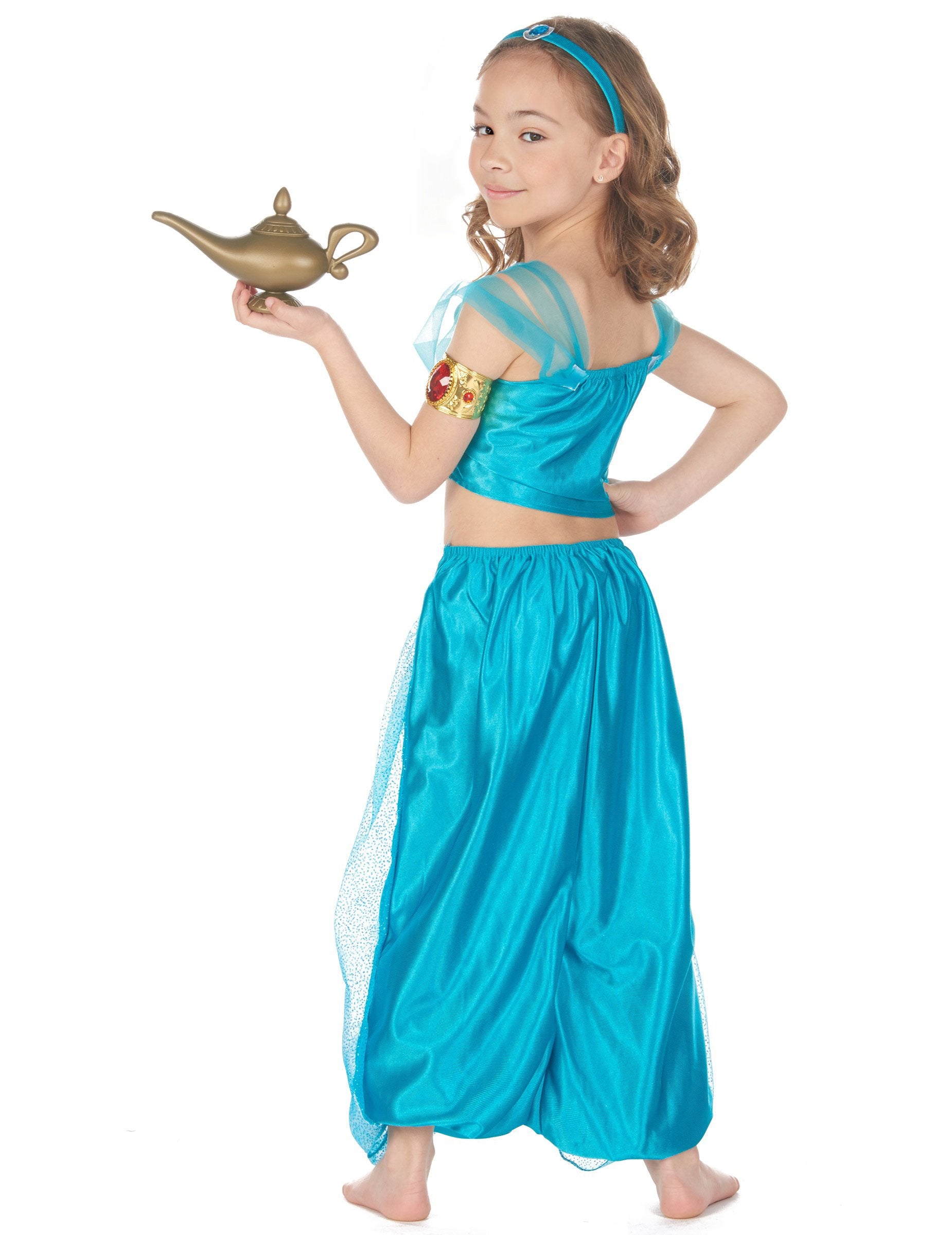 Acest costum de printesa orientala este format dintr-un top, pantaloni si o bentita. Topul este complet albastru și are bretele subțiri. Un voal albastru transparent și o bijuterie magnifică decorează gulerul. Pantalonii sunt albaștri cu efect de satin și sunt strânși la glezne pentru un efect umflat. Este acoperit cu un voal albastru transparent care este cusut in talie si este decorat cu o piatra pretioasa. Bentita este albastru satinat si decorata cu o bijuterie. Cu acest costum, fiica ta va întruchipa perfect o prințesă orientală magnifică pentru carnaval sau o petrecere de naștere!