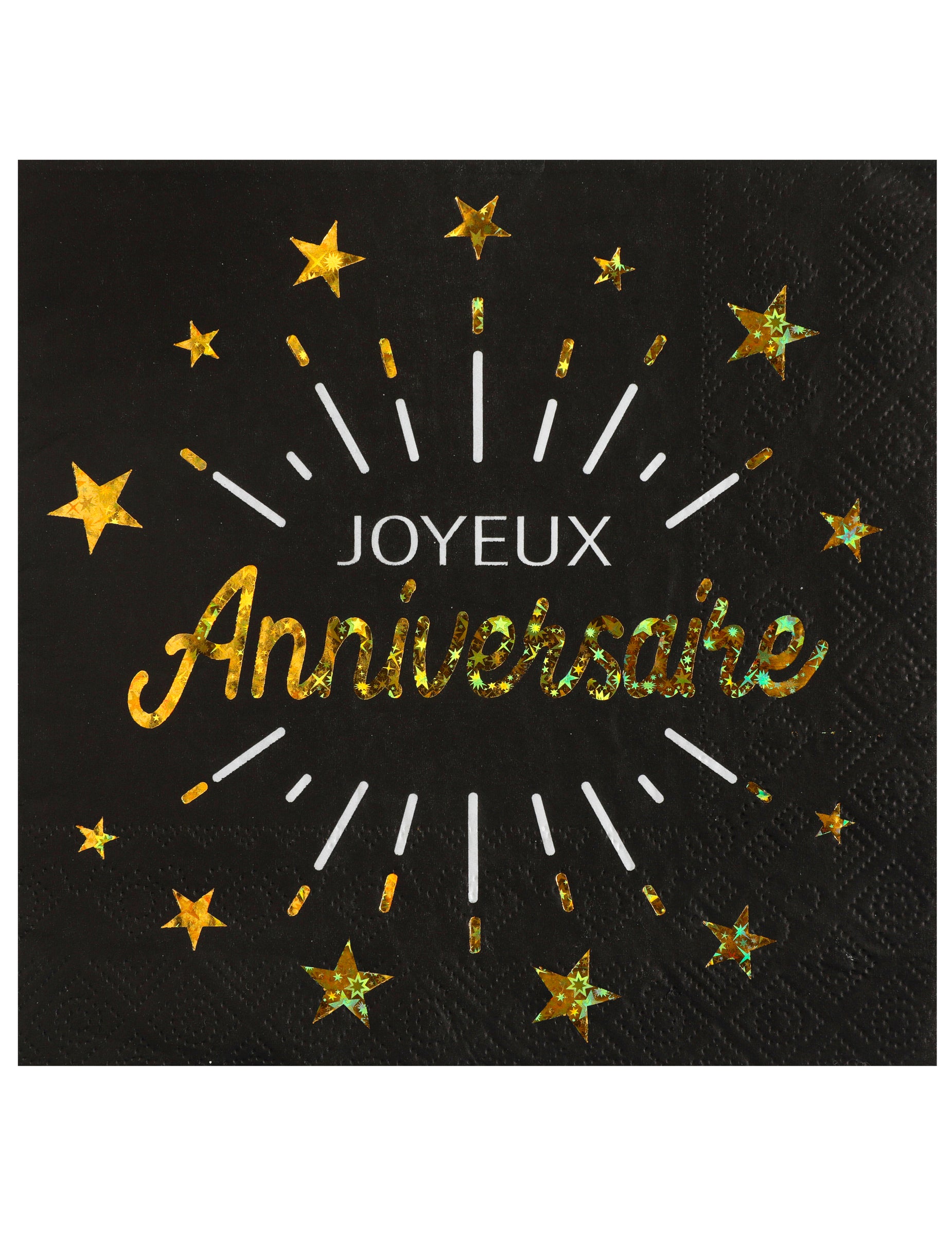 Adaugă o notă de eleganță petrecerii tale cu acest set de 10 șervețele de ziua de naștere 33 x 33 cm. Aceste accesorii de masă negre sunt ilustrate cu mesajul La mulți ani și modele cu stele în alb și auriu. Ideale pentru o decorațiune tematică, acestea prosoape îți va îmbunătăți masă de ziua de naștere cu rafinament.