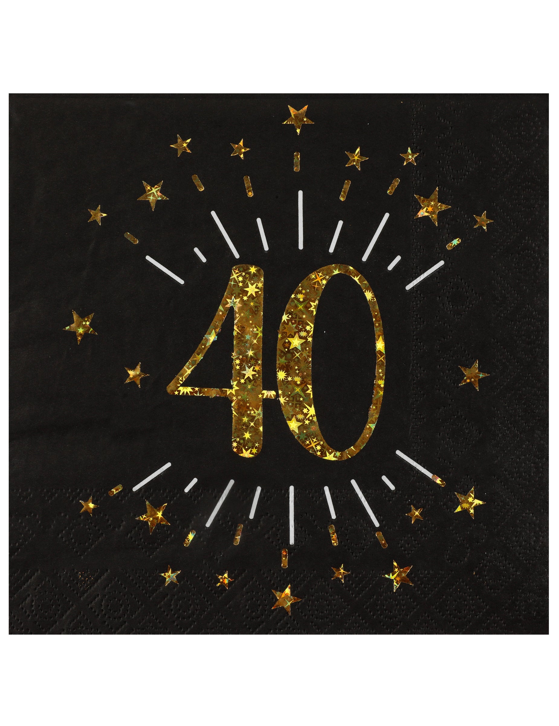 Sărbătorește-ți trecerea la vârsta mijlocie cu stil cu acestea prosoape aniversare specialăAcest set de 10 șervețele negre prezintă o numărul 40 Strălucitoare și înconjurată de stele aurii frumoase. Perfectă pentru a adăuga o notă de vibranță decorului tău. Decorațiuni de masă pentru a 40-a aniversareAcestea adaugă o notă festivă și elegantă recepției tale. Pentru un aspect armonios, îți sugerăm să asociezi aceste articole cu un... Masă pentru ziua de naștere de 40 de ani coordonat cu ceștile și farfuriile din aceeași colecție în nuanțe de negru și auriu.