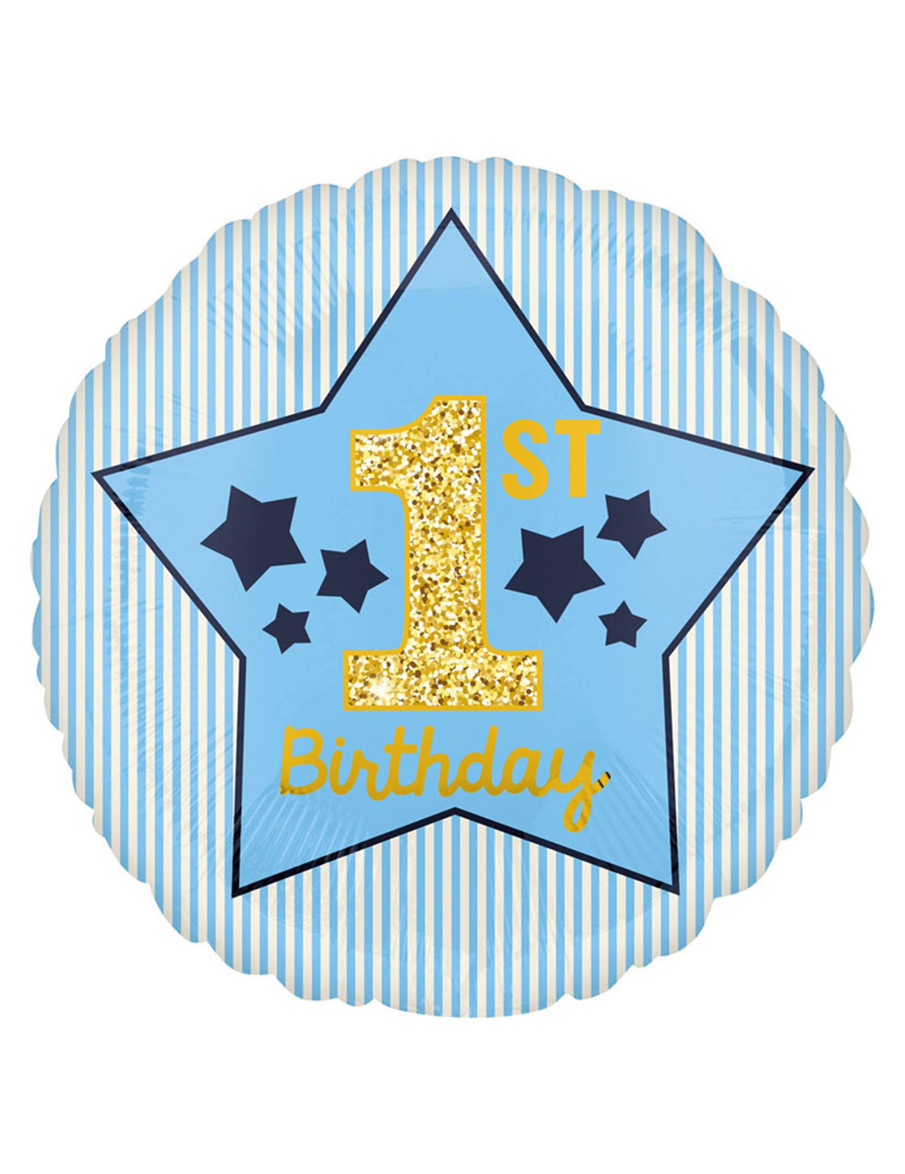 Cu un diametru de 43 cm, Acest minge Cel rotund este fabricat din aluminiu durabil. Designul său este alcătuit din dungi albastre și albe atractive, cu o stea centrală albastru-cer ilustrată cu modele de stele închise la culoare. Textul „prima aniversare„apare cu litere aurii strălucitoare în centrul stelei. Aceasta minge este ideal pentru finalizarea decorațiuni de ziua de naștere cu ocazia 1 an al fiului tău.