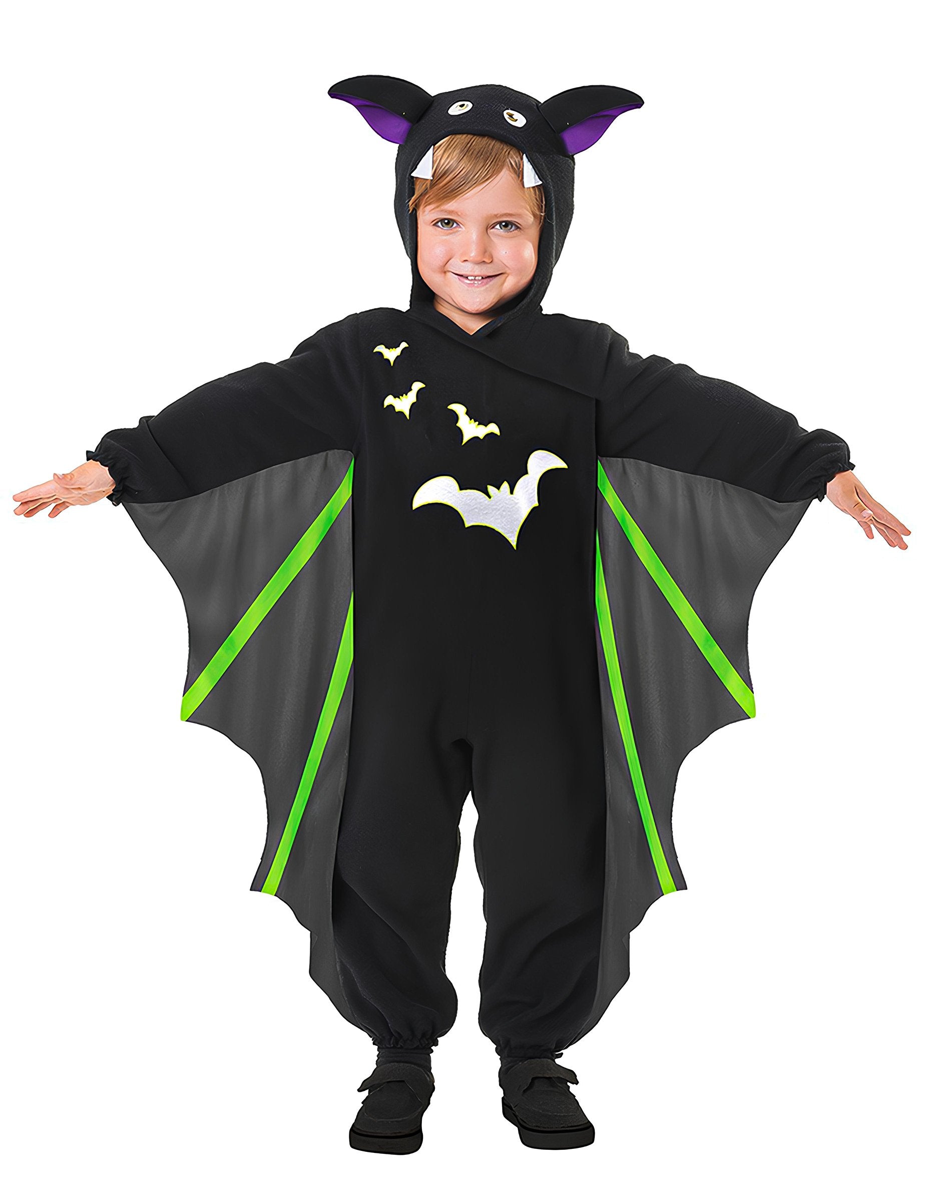 Acest costum de liliac zburător pentru copii constă dintr -o combinație cu capotă (încălțăminte nu este inclusă). Combinația este neagră și tipărită cu lilieci albi în față. Are o capotă care formează capul unui liliac. Aripile sunt negre transparente cu caracteristici verzi. Sunt atârnate pe mânecile și picioarele deghizării. Costumul este strâns de un elastic la încheieturi și glezne. Acest costum de liliac zburător va fi ideal pentru copilul dvs. cu ocazia serii de Halloween!