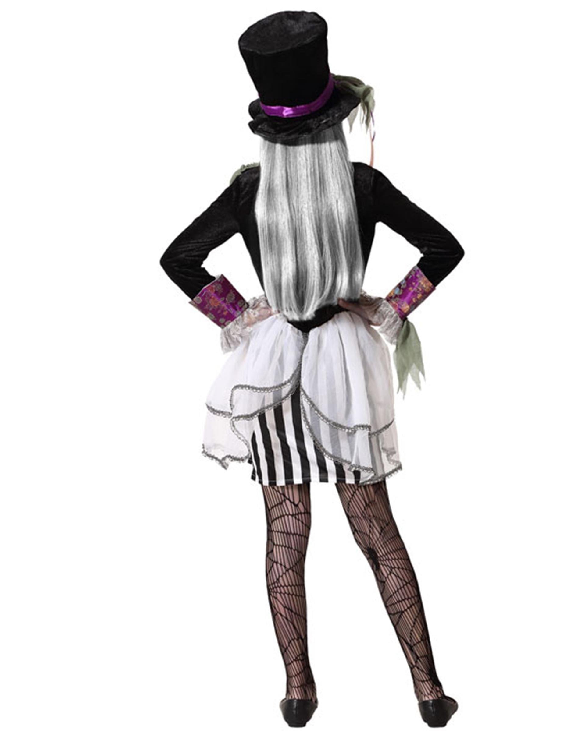 Acest costum de pălărie întunecat pentru fată este format dintr -o rochie și o pălărie (ceașcă, colanți și încălțăminte nu sunt incluse). Rochia de pălărie imită o geacă neagră deschisă pe un blat gri. Reversul este de culoare violet. Partea de jos a rochiei este cu dungi alb -negru. Este trecut cu vederea cu gri gri. Pălăria este un top negru. Este împodobit la baza sa cu o bandă violet, această deghizare completă va fi perfectă pentru a vă transforma într -o versiune funerară nebună pentru Halloween.
