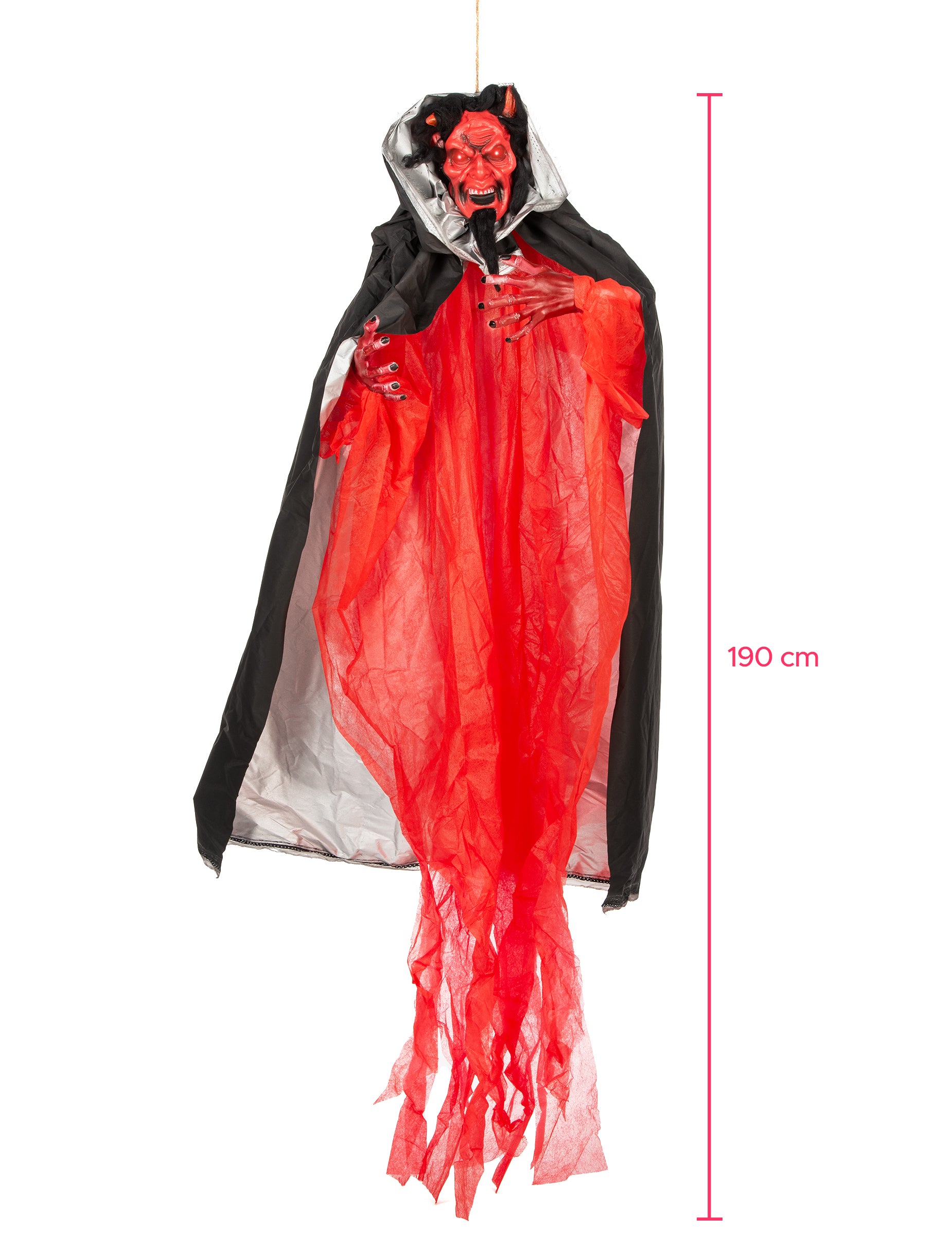 Acest decor animat și luminos reprezintă un demon. Totul este îmbrăcat în roșu și are capul unui demon cu coarne și un barbichette negru. Această decorare măsoară aproximativ 190 cm lungime. Ochii sunt strălucitori și vor deveni roșii prin iluminare. Funcționează cu 3 baterii LR44. Va fi perfect pentru decorarea casei tale în seara de Halloween.