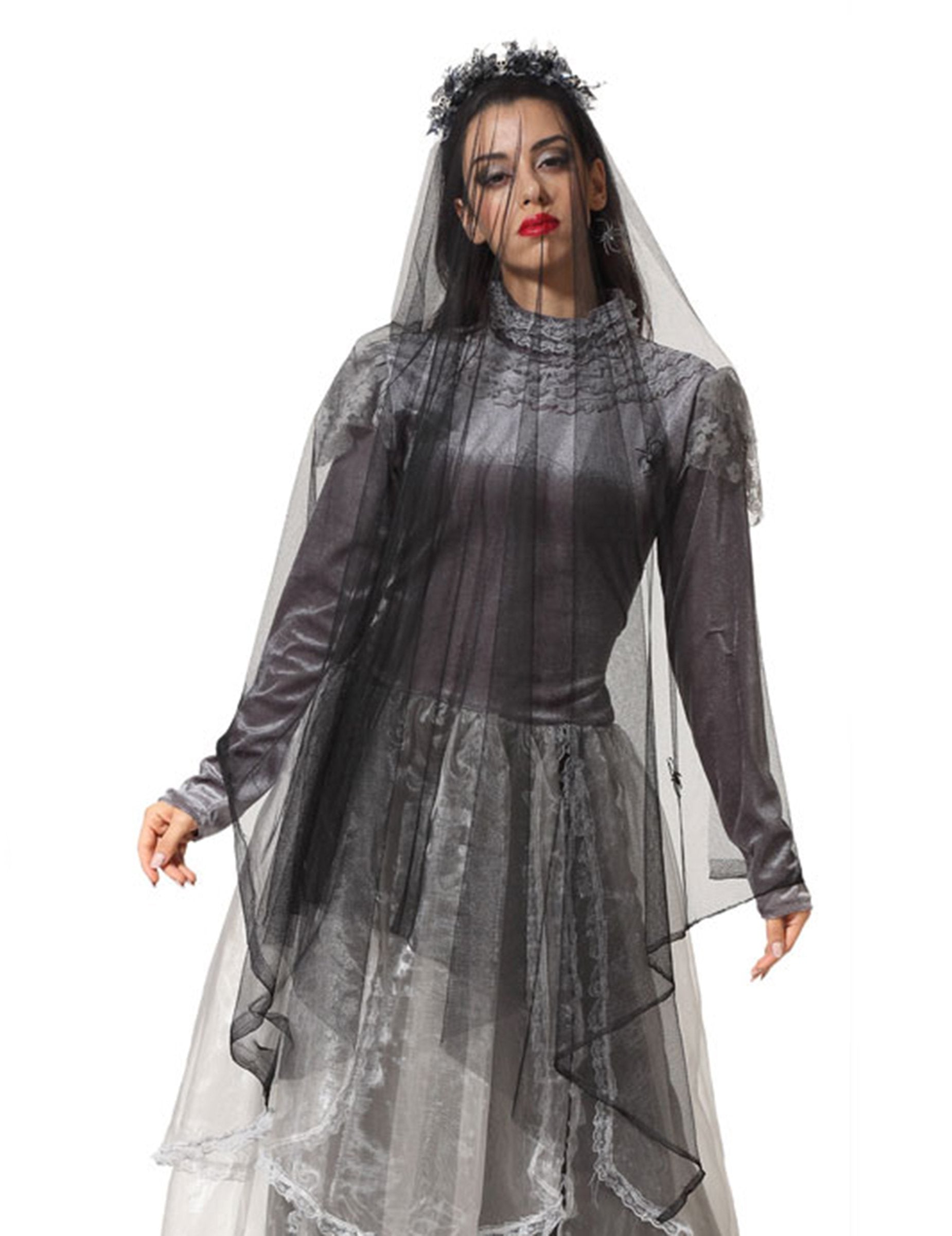 Acest voal de mireasă funerar lung este pentru adulți. Este fixat pe o bandă cu schelete mici. Acest voal lung va fi perfect pentru a -ți completa costumul de nuntă fantomatică pentru Halloween.