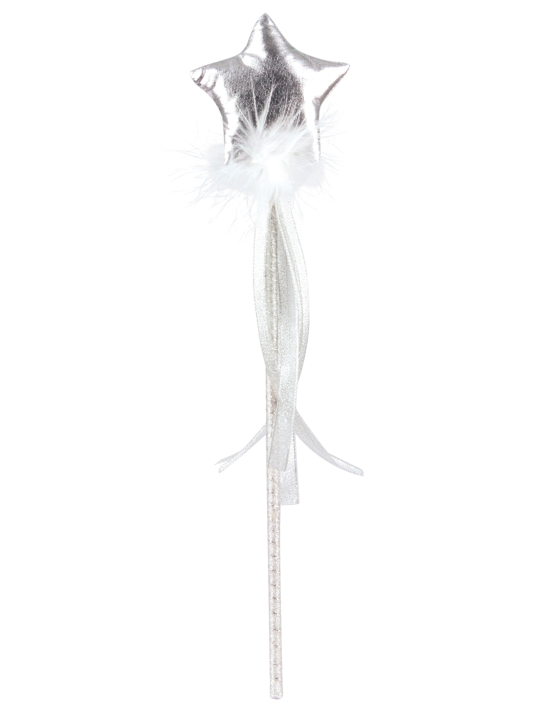 Această baghetă de basm este pentru fată. Această baghetă are un mâner de argint. În partea de sus este o stea în țesătură metalică de argint. Pe baza stelei sunt prezente pene destul de albe cu panglici de argint. Această baghetă va fi accesoriul perfect pentru un costum de zână sau prințesă pentru o zi de naștere pe tema basmelor.