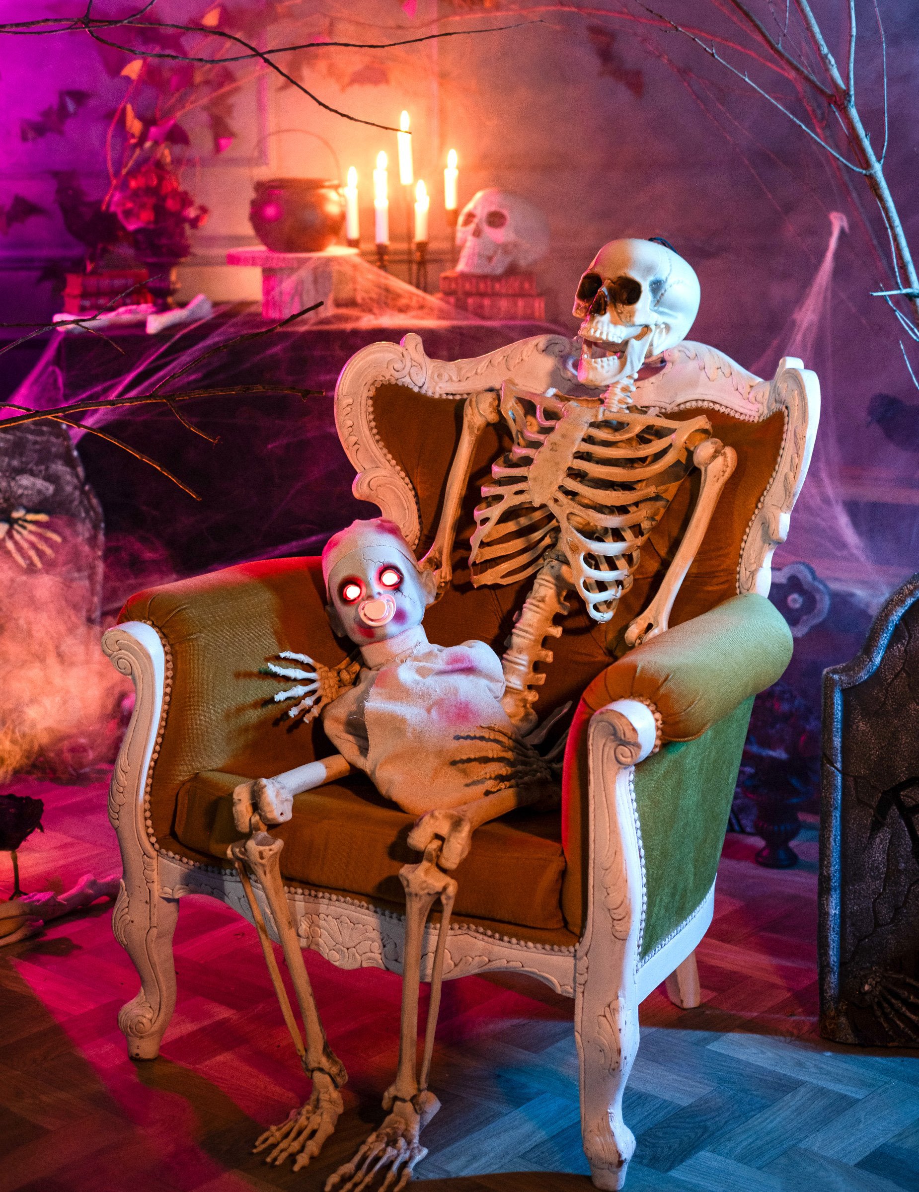 Acest decorațiune pentru bebeluși zombi măsoară aproximativ 50 cm. Are lumini și sunete (bateriile nu sunt incluse).