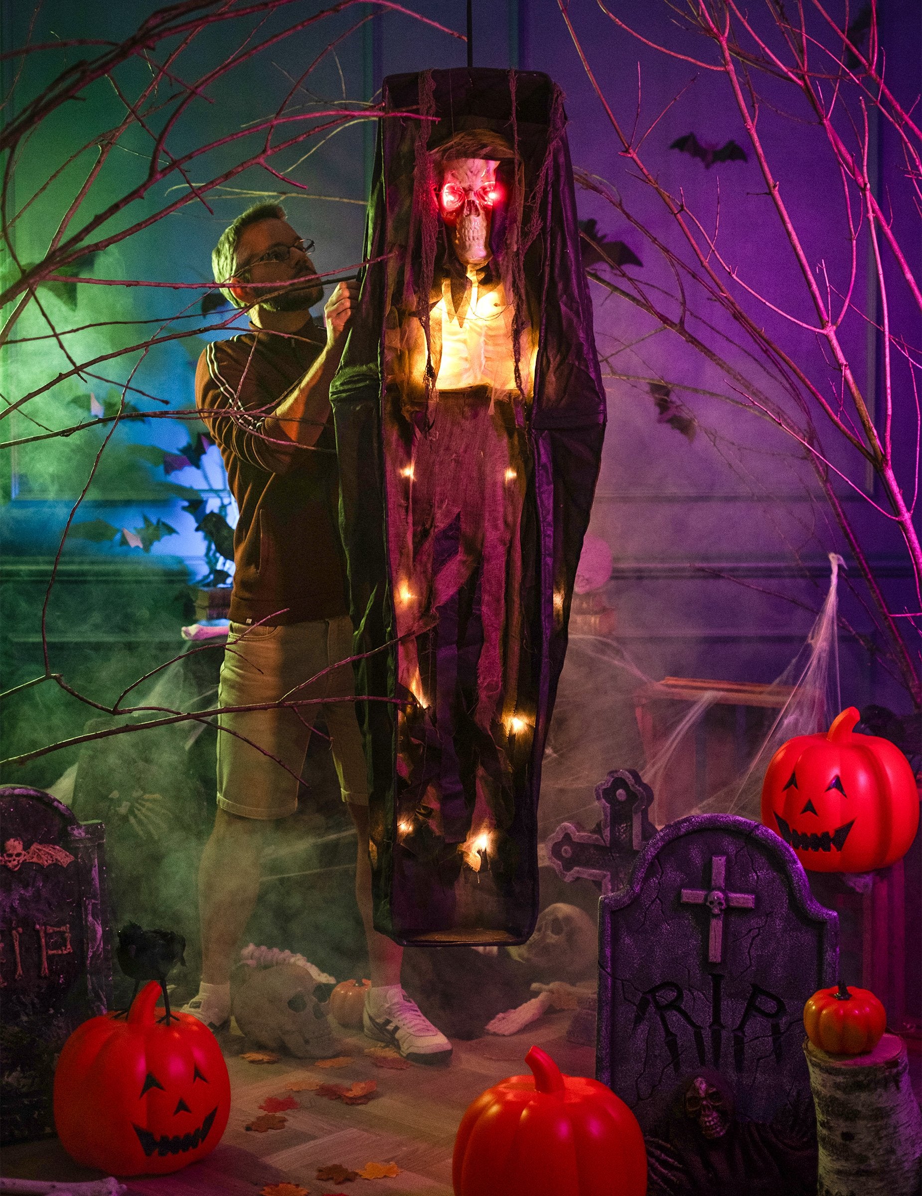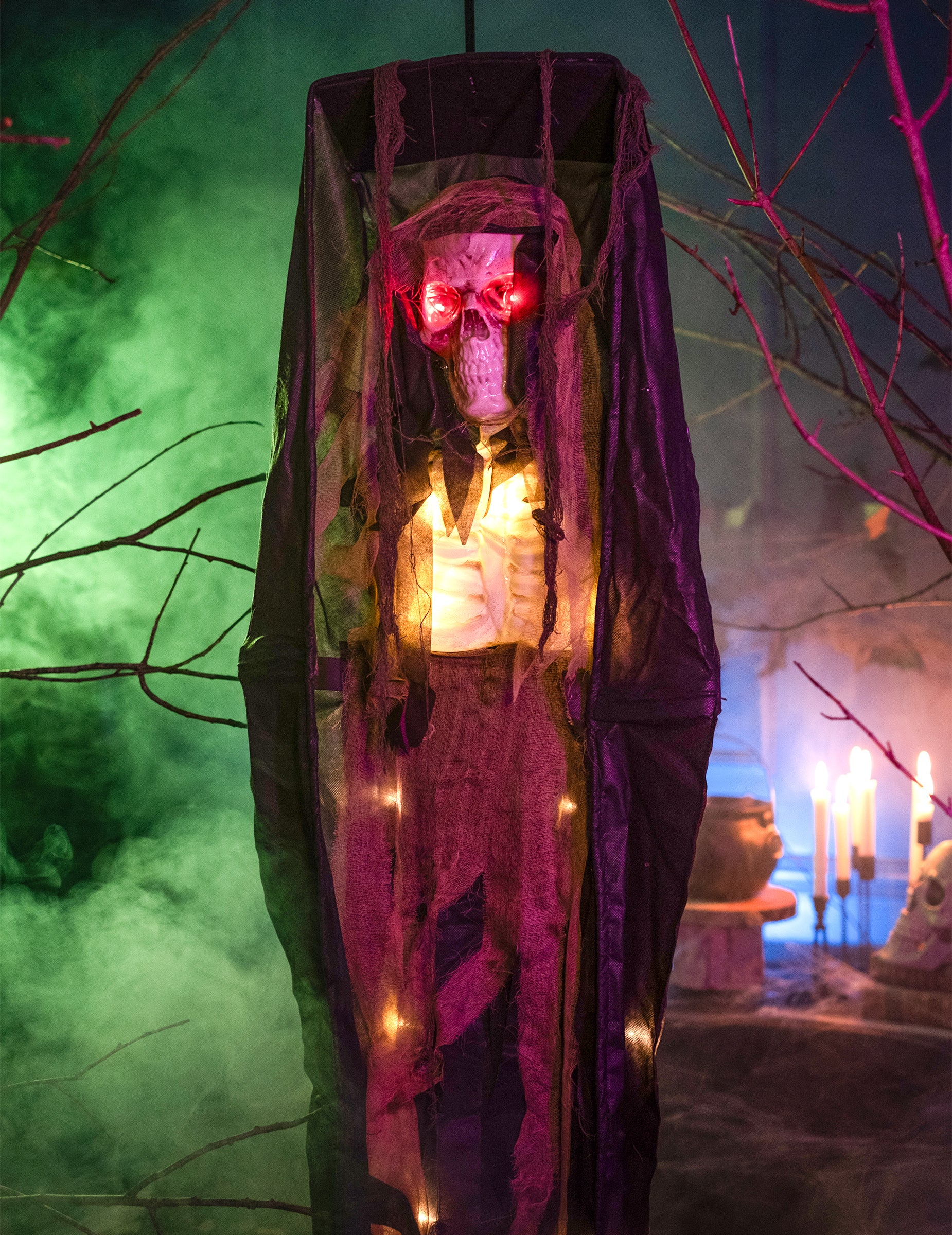 Această decorare luminoasă a sicriului măsoară 160 cm. Sicriul este negru și un schelet gri este prezent în interiorul acestuia din urmă. Scheletul este cu glugă cu o rochie neagră. Decorația se aprinde cu 3 baterii AA. Agățați acest decor luminos de sicriu acasă pentru seara de Halloween!