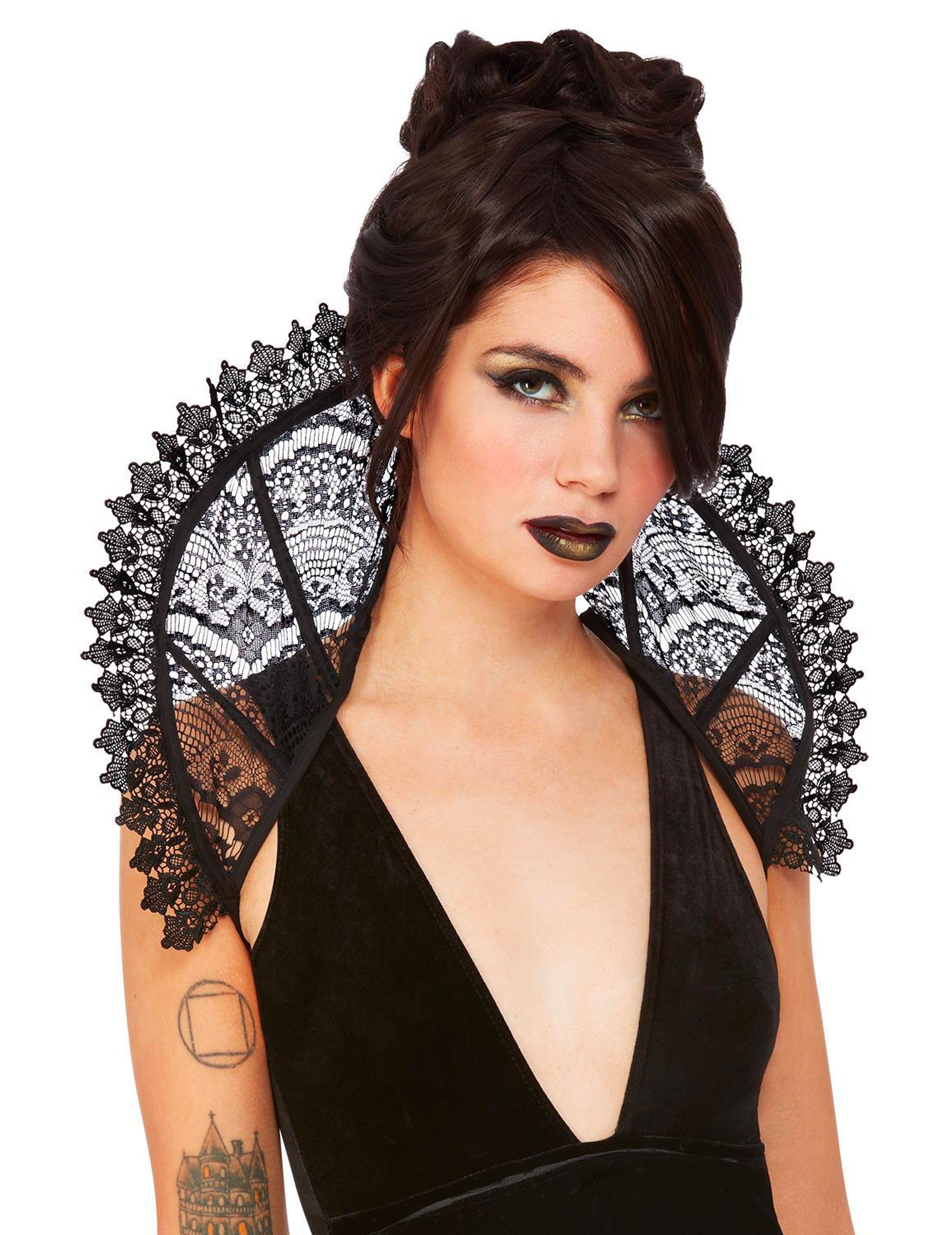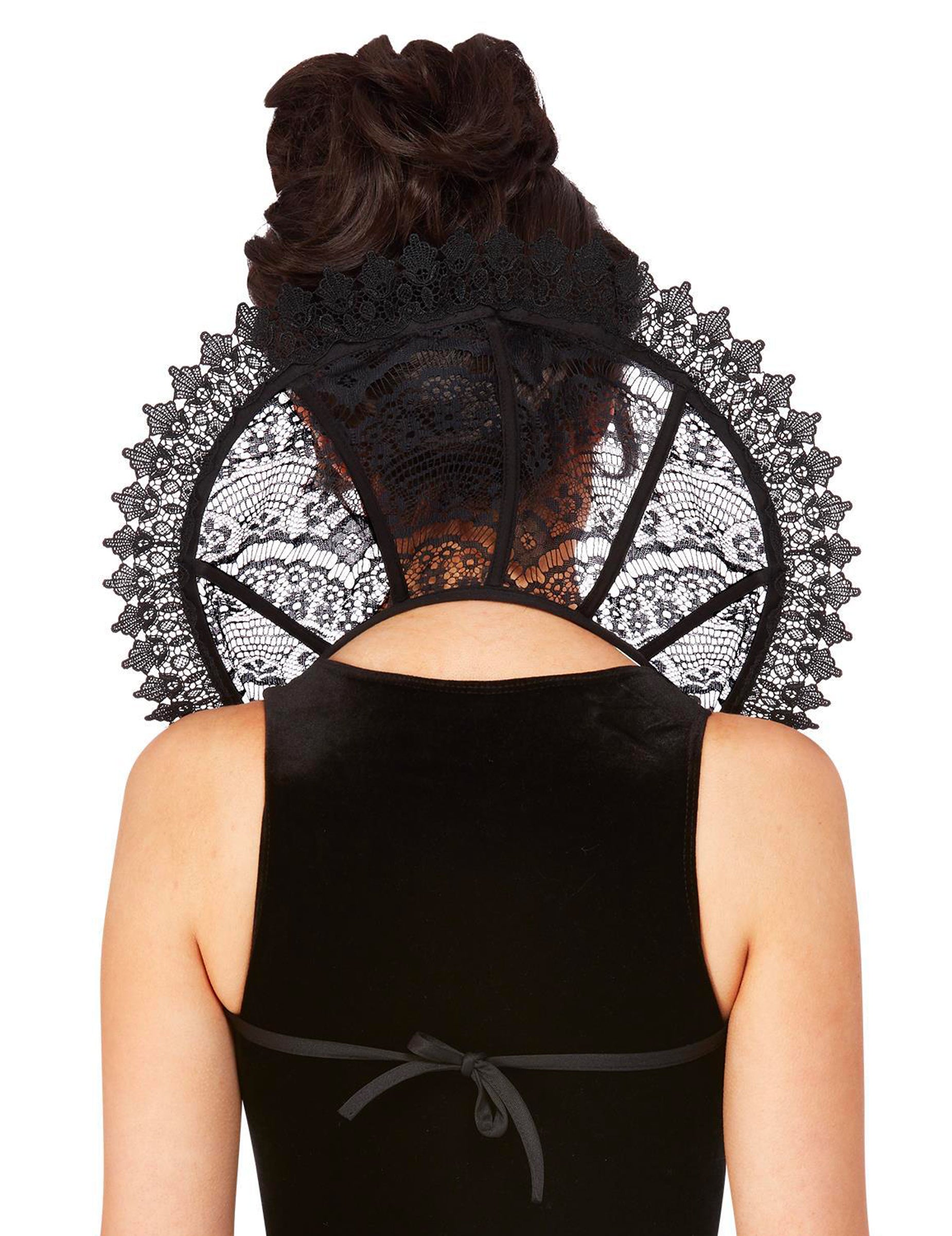 Acest guler de dantelă neagră este destinat femeilor. Acest guler trebuie să fie pus pe umeri. O legătură pentru a merge sub brațe și atașarea la spate asigură un sprijin bun pentru acest guler drept. Întăririle rigide pot menține forma acestui guler. Un guler superb pentru a finaliza multe deghizări, cum ar fi gotic, vampir, vrăjitoare malefică în seara de Halloween.