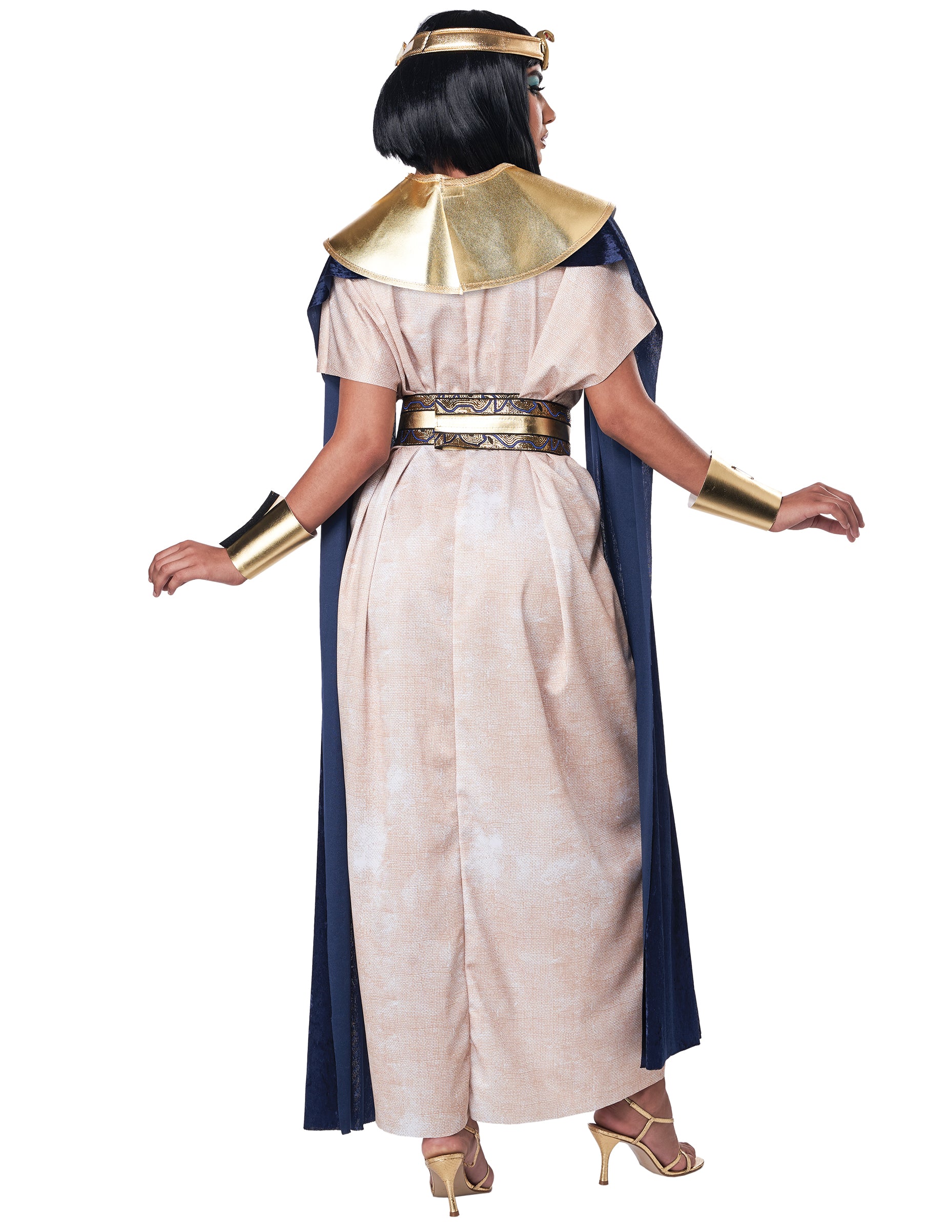 Acest costum egiptean antic este pentru adulți și mixt, femeile și bărbații îl pot purta. Este format dintr -o rochie, o centură, o pereche de manșete, un plastron, o eșarfă lungă, o șapcă și un banner (sceptrul și pantofii nu sunt incluse). Rochia este complet ECRU cu mâneci scurte pe care este depusă o eșarfă lungă de catifea albastră pentru a completa ținuta egipteană. Pentru accesorii, un plastron auriu ocupă culoarea manșetelor, dar și centura care este decorată cu arabesques și o secțiune acoperă o parte a rochiei vertical. Pe de altă parte, coafura este cu dungi albastre și aurii și o bandă decorată cu un șarpe vine să -l țină pe cap. Deghizați -vă ca un egiptean al antichității mai adevărat decât viața cu acest costum complet!