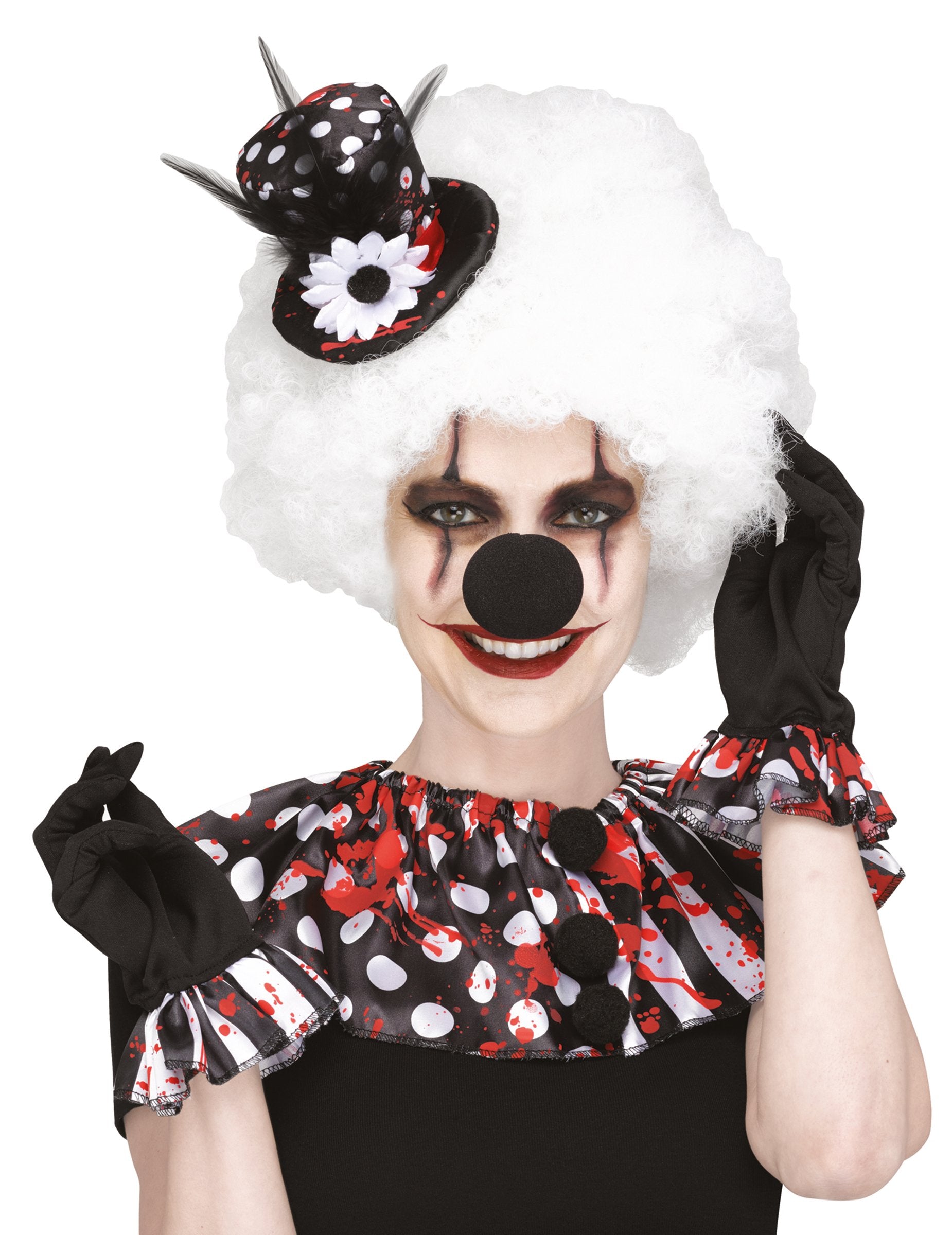 Acest kit de clovn macabru este destinat adulților. Este format dintr -un guler, o pereche de mănuși, un nas de clovn și o mini pălărie (perucă, machiaj care nu este inclus). Gulerul este listat la nivelul gâtului și apoi a fost evazat mai târziu. Este negru cu puncte albe și observat cu sânge fals. Trei mici pompele sunt cusute în fața unei treceri superbe. Mănușile negre sunt decorate cu volan care se potrivește cu trecerea. În cele din urmă, aveți o pălărie neagră decorată cu aceleași imprimeuri ca și trecerea, precum și o floare albă și neagră. Kit -ul de clovn macabru vă va aduce partea înspăimântătoare pe care o căutați pentru petrecerea de Halloween!