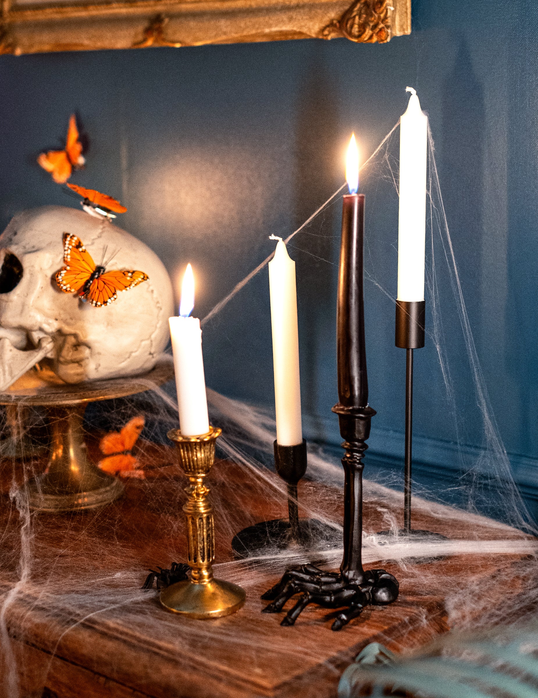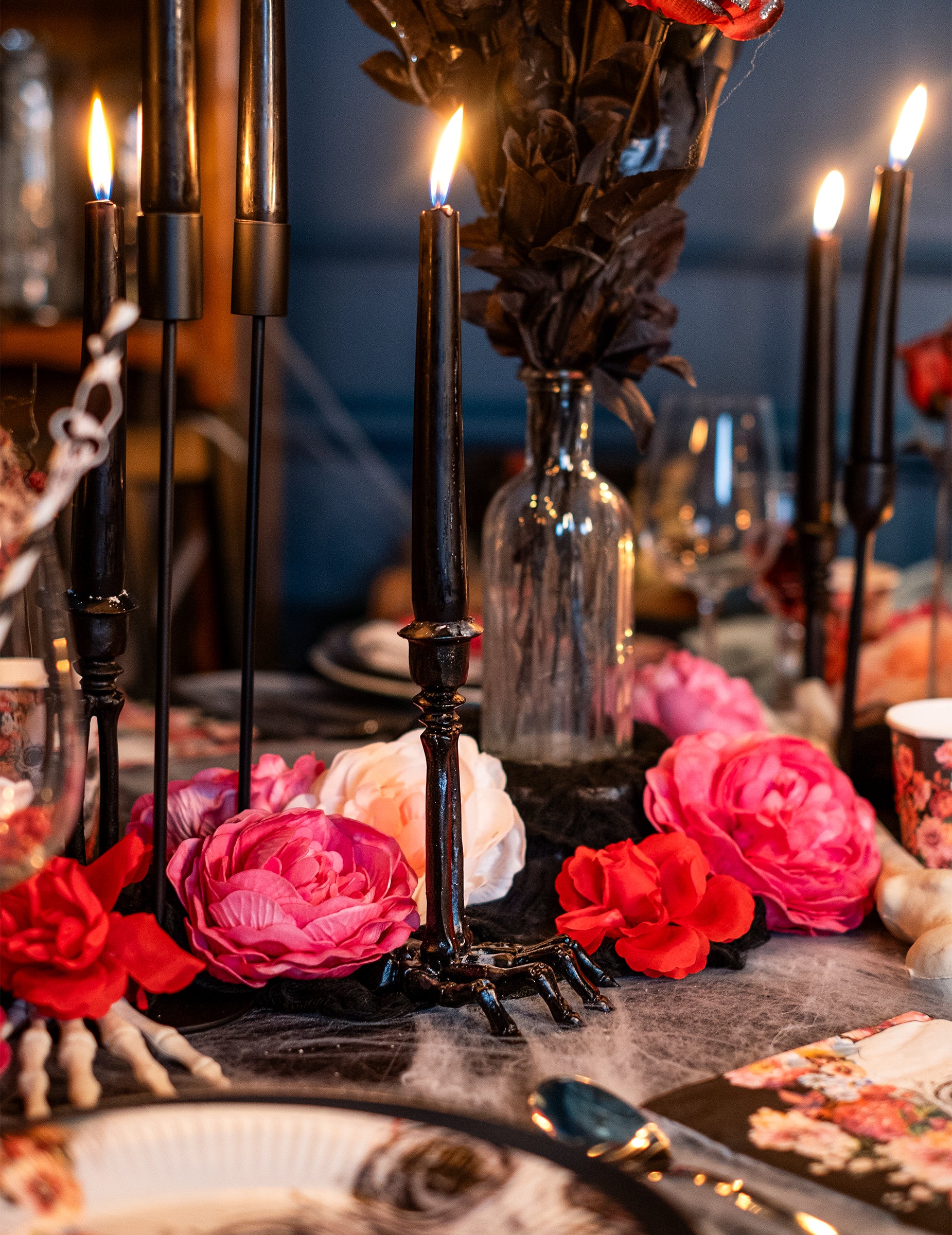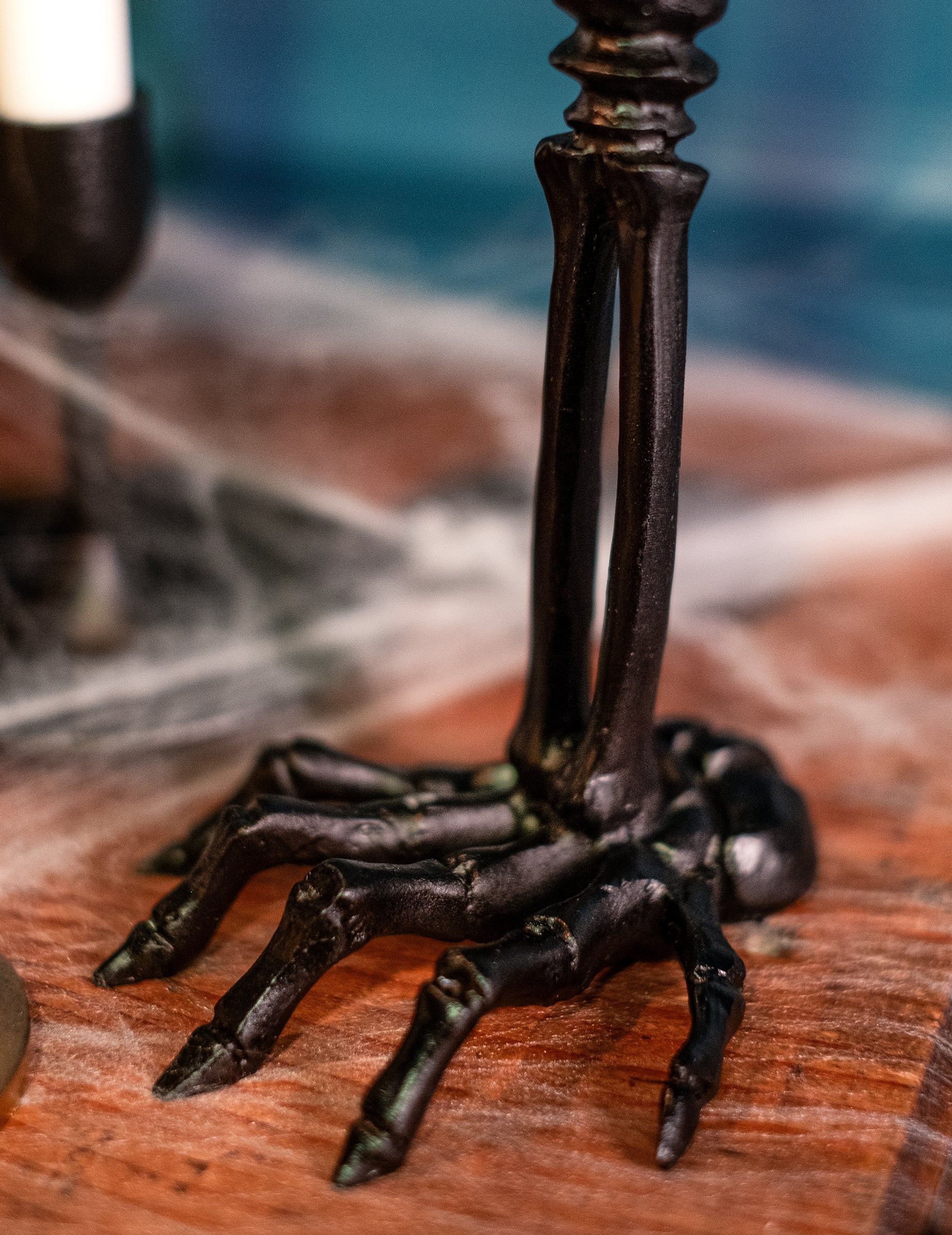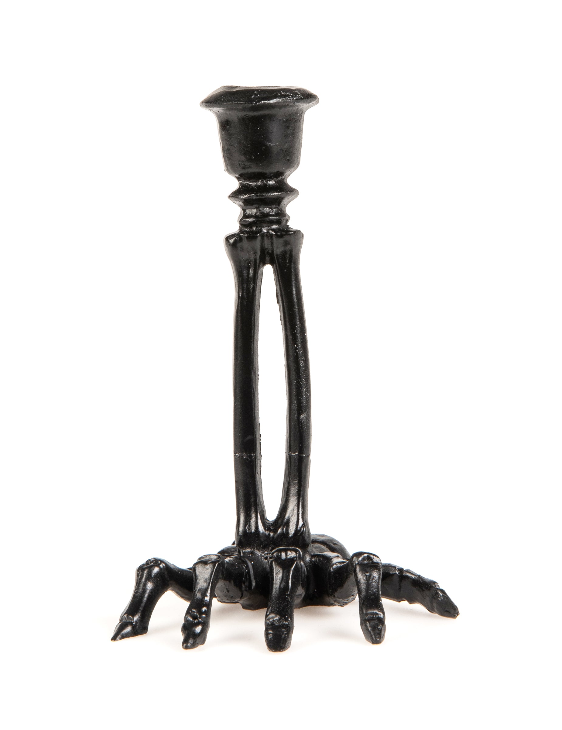 Acest candelabru schelet este fabricat din rășină și măsoară aproximativ 16 cm.