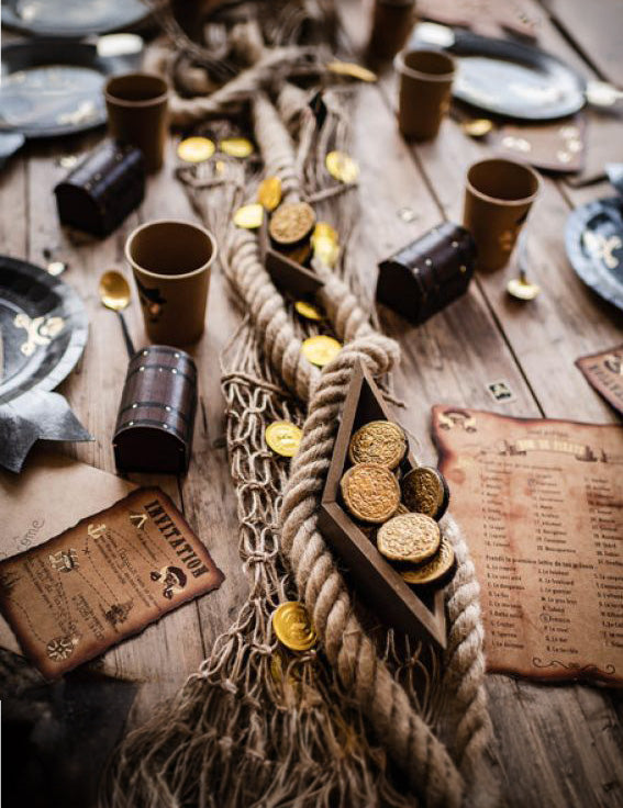 Ce kit contient 8 invitations en papier kraft accompagnées de leurs enveloppes marron. D'un format de 10 x 15 cm, chaque carte d'invitation arbore un visuel de carte au trésor à compléter avec la date et le lieu du rendez-vous. Glissez-les simplement dans leur pochette pour convier vos invités. Ces éléments de papeterie sont parfaits pour plonger les enfants dans l'ambiance d'un anniversaire pirate.