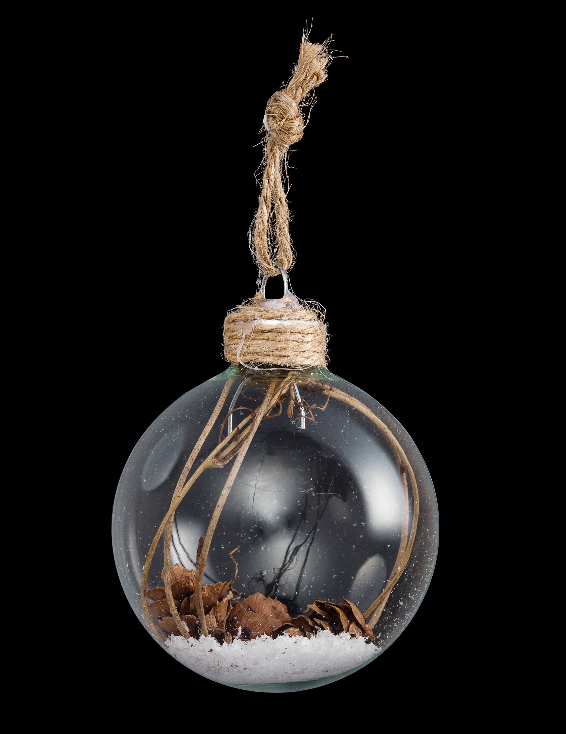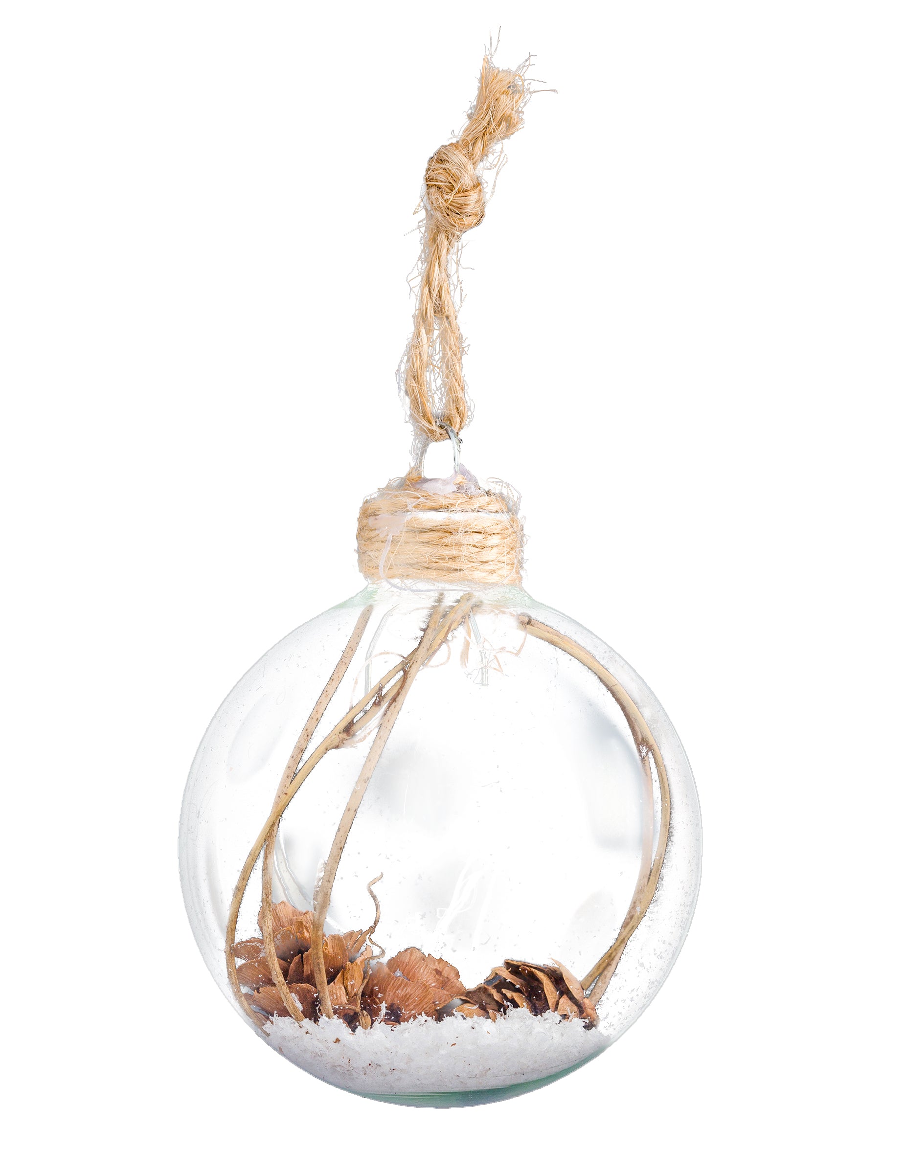 D'un diamètre de 6 cm, cette boule transparente en verre renferme un décor hivernal authentique. Elle contient de véritables pommes de pin, des morceaux de bois et de la neige artificielle pour un rendu poétique. Grâce à son attache en corde, cette boule de Noël apporte une touche rustique et organique à votre sapin. Optez pour une ambiance douce et conviviale durant les fêtes de fin d'année.