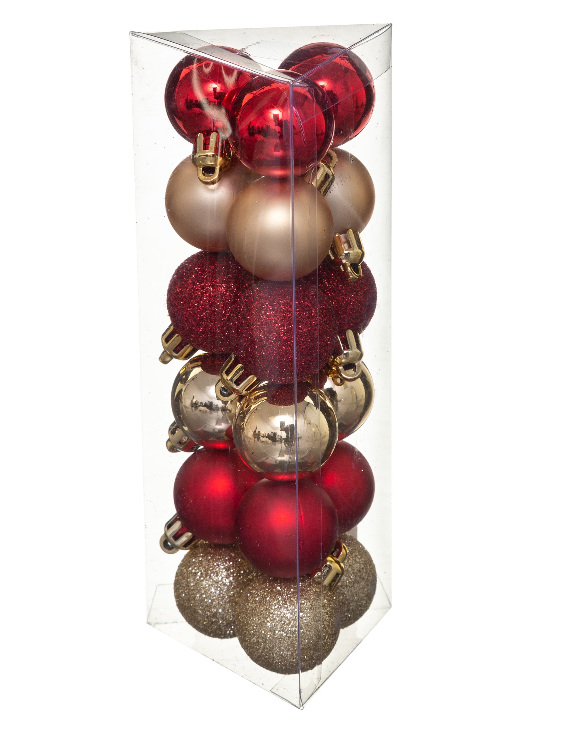 Acest set este format din 18 mingi de Crăciun. Sunt roșii și aurii, cu un efect sclipitor, mat și strălucitor. Fiecare bilă are un diametru de aproximativ 3 cm. Acest set de bile este ideal pentru decorarea pomului de Crăciun în tonuri roșii și de aur!