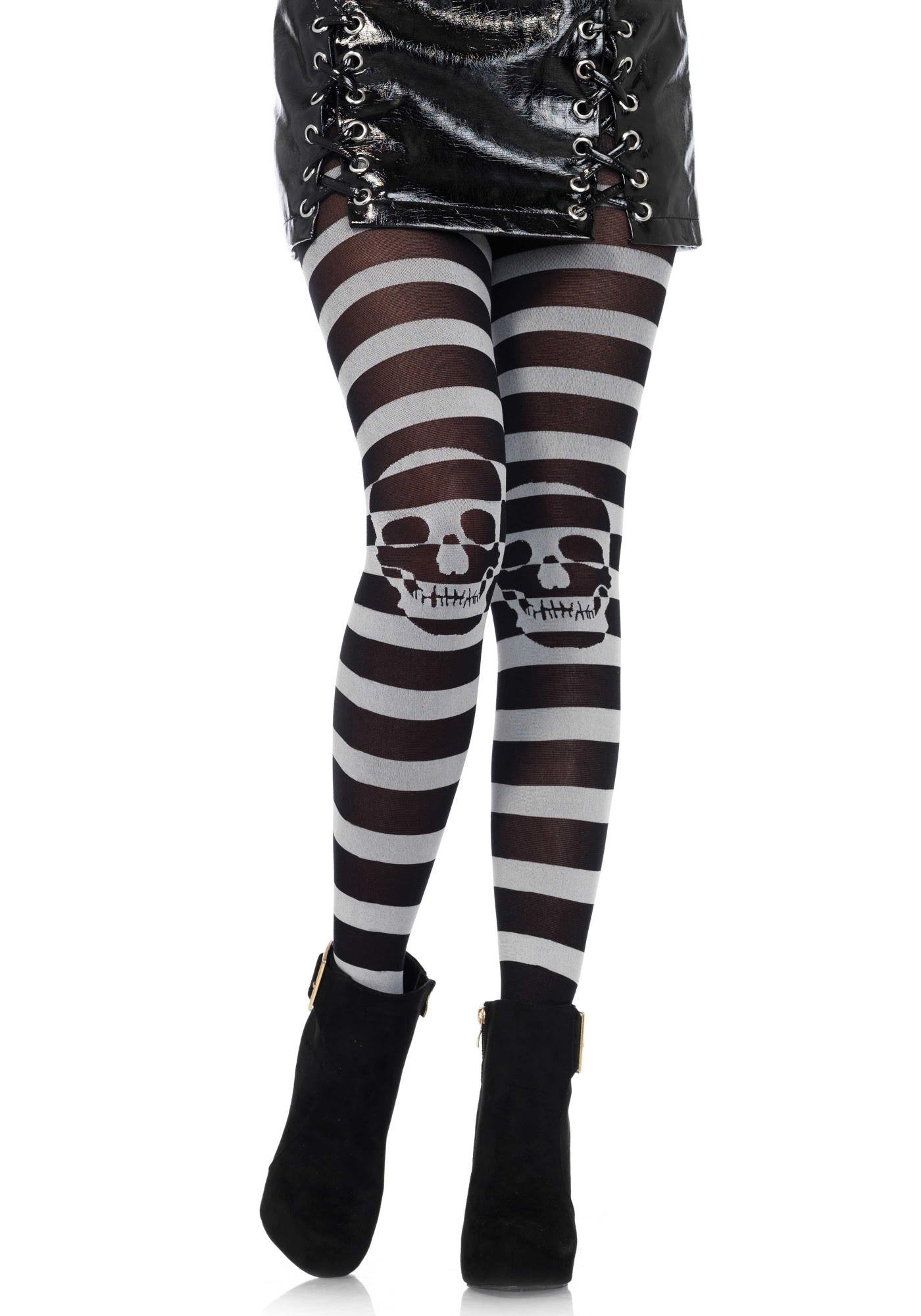 Acești colanți de damă au dungi albe și negre și un imprimeu cu cranii la genunchi. Sunt perfecți pentru a completa costumul de pirat pentru Carnaval.