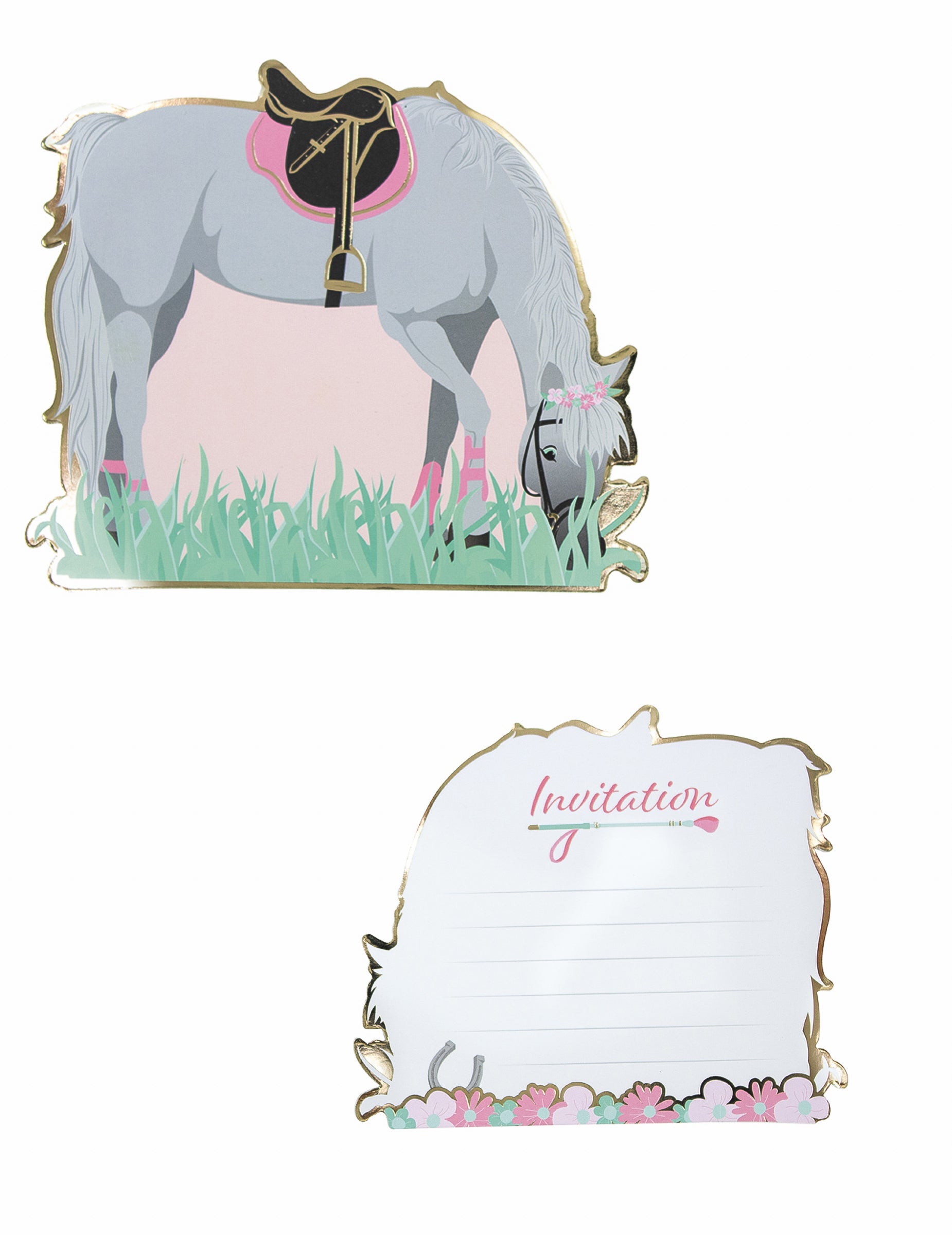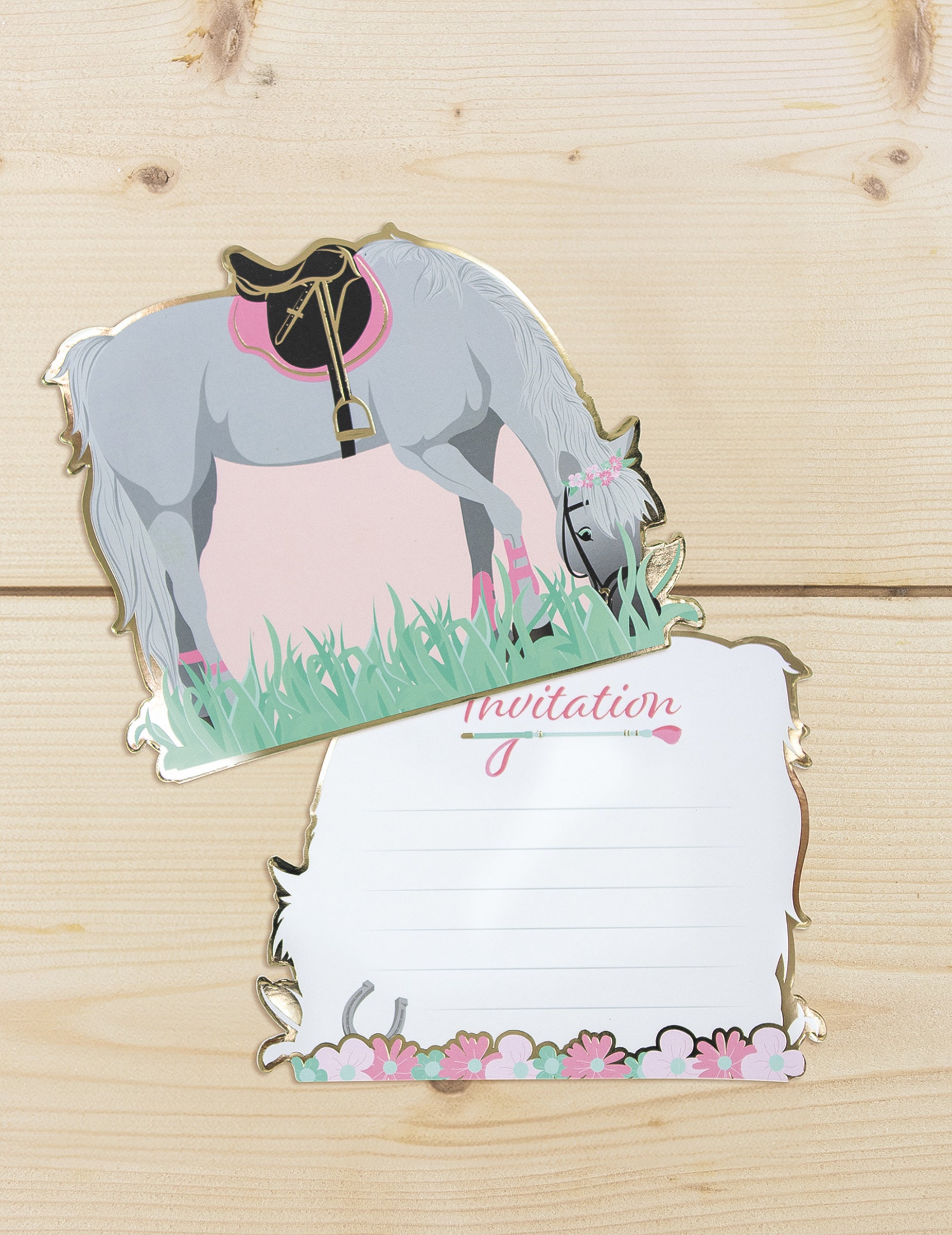 Acest lot este format din 8 cărți de invitație măsurând aproximativ 13 cm. Fațada este ilustrată de o cal Gri păscând într-o pajiște, în timp ce verso-ul este rezervat pentru scrierea detaliilor sărbătorii. invitații îi va permite fiicei tale să-și invite prietenii la o ziua de naștere pe tema călăriei.