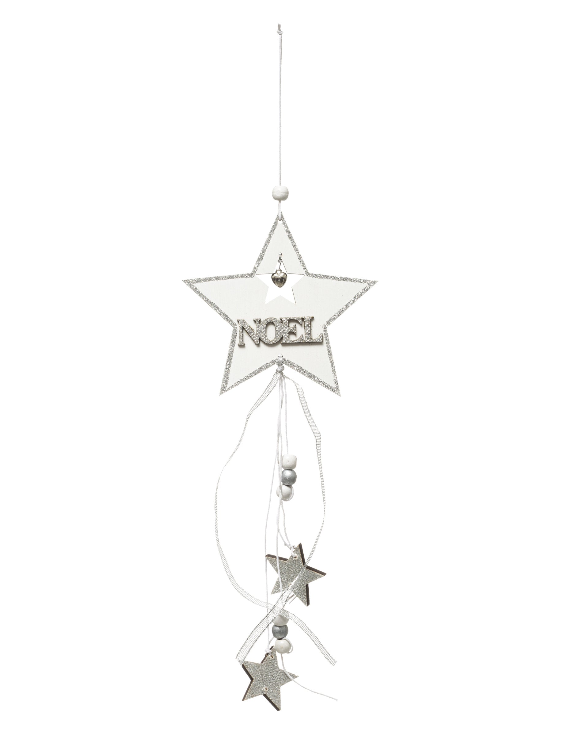 Cu o înălțime de 35 cm, acest suspensie se distinge prin dimensiunea sa mare stea afișarea centrală a mesajului CrăciunElementele argintii în formă de stea sunt atașate delicat de panglici pentru un efect aerisit. Agățați asta stea pentru a adăuga o notă de magie Decorațiuni de Crăciun.