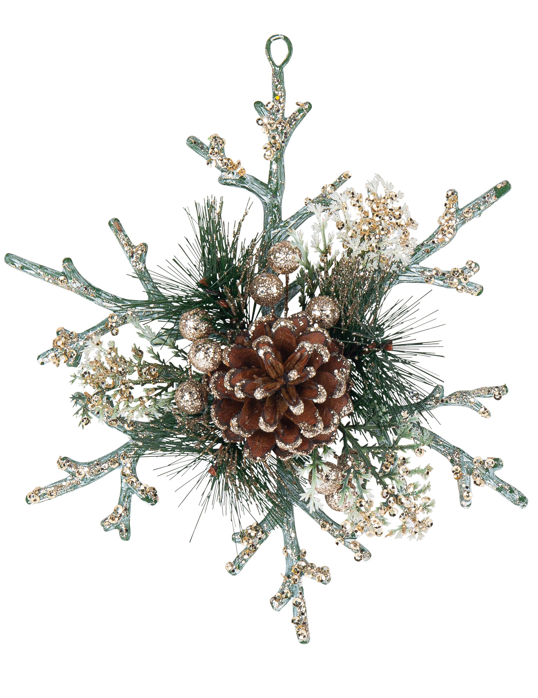 Cu un diametru de 19,5 cm, Acest piesă centrală Se prezintă sub forma unui fulg de zăpadă de iarnă. Structura sa naturală este decorată cu crenguțe, conuri de pin adevărate și fructe de pădure mici acoperite cu sclipici de culoarea șampaniei. Practic, acest... zăpadă naturală Are o deschidere pentru agățare ușoară cu o panglică sau sfoară. Este accesoriul perfect pentru a crea o atmosferă magică în casa ta în timpul sărbătorilor. sărbători de Crăciun.